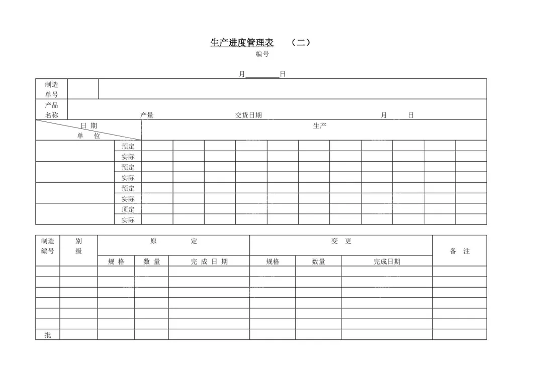 在中小制造企业、加工工厂的日常生产运营中,清晰规范的生产进度管控是保障订单按时交付、优化生产排程的核心环节,这款专业的生产进度管理表(二),就是专为生产部门打造的轻量化进度记录工具,能够帮助生产管理人员快速理清生产脉络,规避延期交付风险。从格式设计来看,这张生产进度管理表(二)采用清晰的黑白纸质表格样式,结构分层明确,填写逻辑符合生产管理的日常习惯,哪怕是非专业管理人员也能快速上手使用。表格顶部设置了专属标题、编号栏和填写日期栏,方便生产管理人员按日期归档整理,后续需要调取历史生产数据时,能够快速检索定位,提升生产数据管理效率。表格上方区域专门预留了制造单号、产品名称、产量和交货日期的填写位置,核心生产订单信息一目了然,拿到表格就能快速对应对应订单信息,不会出现混单错单的问题。表格主体区域支持按生产单位分组,记录多组生产预定进度与实际完成进度数据,管理人员可以直观对比计划与实际的偏差,一旦出现进度滞后就能及时调整生产排程、调配人力产能,避免影响整体交付。在表格下方区域,还专门设置了制造编号相关信息的登记板块,可以清晰记录制造编号的级别、原定规格、变更规格,原定数量、变更数量以及原定完成日期和变更完成日期,完美适配生产过程中常见的订单变更需求,避免变更信息混乱遗漏。此外还预留了专属备注栏,可以记录生产过程中的特殊要求、突发问题等额外信息,全方位满足工厂生产进度管控的各类需求,是生产部门提升管理效率的实用工具。