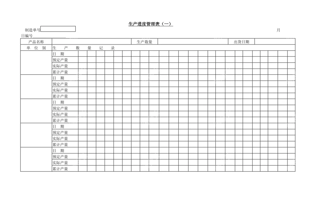 这份标准化的生产进度管理表,是生产制造企业优化生产管控、梳理生产流程的实用管理工具,能够清晰记录全生产周期的核心进度信息,帮助生产管理人员实时掌握订单动态,及时调整生产安排,解决生产进度模糊、交付逾期等常见生产管理痛点。这份名为《生产进度管理表(一)》的管理表格,无论是纸质打印使用还是电子文档编辑,都能适配中小制造企业、加工厂的日常生产管理需求。表格的布局设计清晰合理,顶部专门预留了核心基础信息填写区域:设置了制造单号填写栏、日编号填写栏以及月份标注位,方便管理人员按月份和订单快速分类归档;同时还预留了产品名称、生产数量、出货日期的专属填写区域,让每一笔订单的核心基础信息一目了然,无论是订单跟进还是后期复盘都能快速检索定位。表格主体部分按照单位别划分统计维度,每一个统计单元都专门设置了日期、预定产量、实际产量、累计产量的专属记录行,搭配多列空白单元格,支持生产管理人员按日填写每日生产进度数据,精准统计每日生产完成情况。通过每日更新预定产量与实际产量的差值,管理人员可以快速发现生产异常,及时协调产能、解决生产瓶颈,避免小问题累积影响整体出货交付。对于生产制造企业来说,这份规范的生产进度管理表可以覆盖从订单接收到成品出货的全流程进度管控,帮助团队梳理生产计划,同步生产信息,降低沟通成本,有效提升生产效率,保障订单按时出货,是生产部门不可或缺的生产管理辅助工具。