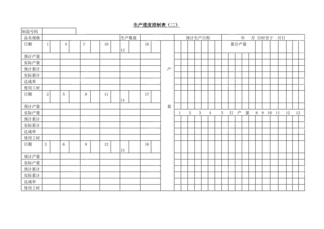 对于生产制造型企业来说,精准管控生产日程、实时跟踪生产进度是保障交期、降低生产成本、提升生产效率的核心环节,这款专业的生产进度控制表(二),正是为中小制造企业、生产车间打造的实用生产管控工具,能够帮助生产管理人员清晰梳理全流程生产数据,轻松落实生产进度管控要求。这张标准化的生产进度控制表(二)为纸质表格文档,整体框架清晰,分类明确,完全贴合生产车间日常数据记录的使用习惯。表格顶部清晰标注了「生产进度控制表(二)」的标题,方便生产管理人员快速分类收纳、查找取用。表格左侧区域预留了核心基础信息填写栏,可完整记录制造号码、品名规格、计划生产数量,还设置了专门的预计生产日程填写板块,帮助管理者提前梳理整体生产排期,明确生产节点要求。为满足全月每日生产进度跟踪需求,表格划分了1-18号共18组独立的日期记录栏,每组日期栏下都细分了预计产量、实际产量、预计累计产量、实际累计产量、达成率、使用工时六个填写行,生产现场工作人员可以每日按时填写,直观对比每日计划与实际生产的偏差;在表格右侧区域,还额外设置了总累计产量统计栏,以及按1-13日排列的二次产量统计分区,方便生产管理人员快速汇总、交叉核对生产数据。无论是每日班前的生产排产、班后的生产数据汇总,还是月度生产达成率核算、生产工时统计,这款生产进度控制表(二)都能满足需求,帮助生产团队实时掌握生产进度,及时调整生产安排,避免因进度延误导致的交期违约风险,是生产车间不可或缺的生产管控工具。