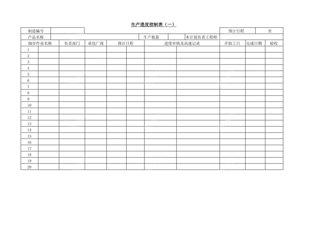 这是一份专业实用的生产进度控制表模板,专为生产制造企业规范生产流程、管控项目进度打造,能够帮助生产管理团队清晰梳理全生产环节,高效追踪每一项作业的推进情况,是生产管控环节不可或缺的实用工具。这款生产进度控制表模板为标准化电子表格格式,文件命名为《生产进度控制表(一)》,整体结构清晰、分类明确,完全贴合中小制造企业、大型工厂的日常生产进度管理需求。在表格的顶部设置了核心基础信息填写区域,涵盖制造编号、产品名称、生产数量、负责工程师以及预计日程五大填写栏,方便管理者在使用之初就快速录入生产项目的核心基础信息,方便后续快速检索、核对项目信息,避免不同生产订单混淆。基础信息栏下方,模板针对生产流程进行了精细化的模块划分,细分出细步作业名称、负责部门、承包厂商、预计日程、进度审核记录、开工完工日期和验收等多个核心管控项目,整份模板共预留了20条作业记录行,不管是工序简单的小型订单,还是环节复杂的大型量产项目,都可以完整记录从开工到交付全流程的每一项作业节点。对于生产型企业来说,精准的生产进度管控直接影响交货效率和生产成本,这款生产进度控制表模板可以帮助管理者实时掌握每一道工序的推进情况,及时发现进度滞后问题,协调负责部门与承包厂商调整生产计划,避免因为工序脱节影响整体交期,无论是车间基层班组长还是生产部门管理人员,都可以直接套用这款模板快速开展生产进度管控工作,无需从零开始搭建表格框架,节省大量的表格制作时间,快速提升生产进度管理效率。