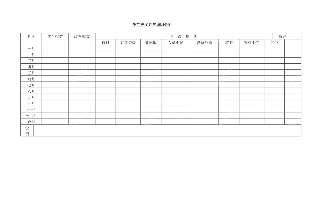 在制造型企业的日常生产管理中,生产进度异常是影响交付效率、生产成本管控的核心痛点,想要针对性优化生产流程、提升产能利用率,一套清晰规范的生产进度异常原因分析工具必不可少。这份专业的生产进度异常原因分析表,就是为生产制造企业量身打造的生产管理工具,能帮管理人员快速梳理全年度生产异常脉络,精准定位影响生产进度的核心问题,助力生产管理优化升级。从表格结构来看,这份生产进度异常原因分析表完全贴合企业年度生产统计需求,表格按全年12个月份设置统计行,基础信息栏包含月份、当月总生产批数、异常改变批数三大核心基础项,方便管理人员快速对应每个月的生产基数;针对常见生产异常场景,表格特意细分了8类核心生产异常更改原因,涵盖待料、订单更改、效率低、人员不足、设备故障、放假、安排不当、其他共8大类,覆盖了生产过程中绝大多数可能导致进度滞后的场景,无论是原材料供应不及时导致的待料停工,还是设备突发故障引发的停产,或是订单临时调整、一线人员缺口等问题,都能找到对应的统计分类。除此之外,表格还设置了专门的备注栏和月度合计行,方便管理人员记录特殊异常情况,快速汇总当月异常总占比;表格底部预留了专属的填写说明区域,可以针对企业自身的生产特性补充统计规则,适配不同类型制造企业的生产管理需求。借助这份生产进度异常原因分析表,生产管理人员可以轻松统计全年度各类型生产异常的发生频率、影响范围,通过年度数据对比精准识别高频问题,进而针对性调整采购排班、设备维护、人员调度方案,从根源上减少生产进度异常的发生,有效提升生产交付效率,降低不必要的生产内耗,是生产管理中不可或缺的实用统计工具。