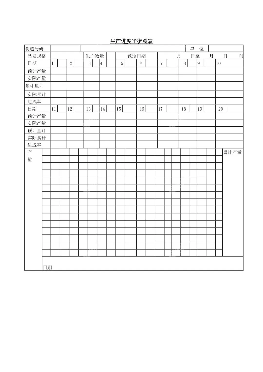 这款专业生产进度平衡图表,是生产制造企业管控生产流程、优化生产效率的实用管理工具,能够帮助生产管理人员清晰梳理每日生产任务,精准把控全流程生产进度,解决生产安排混乱、进度跟踪不及时的行业痛点。本次介绍的这款纸质版生产进度平衡图表,采用清晰规整的黑白表格样式,排版逻辑符合生产车间的日常使用习惯,方便生产一线人员快速填写、随时查阅。图表顶部预留了清晰的基础信息填写区域,可完整记录填写制造号码、生产单位、品名规格、计划生产总数量以及生产预定日期,从源头就做好生产信息的标准化归类,方便不同批次产品的生产进度分类管理,避免多订单混排造成的信息混乱。图表主体按照一个月前20日的生产周期拆分了两大统计板块,针对每一天的生产数据都设置了专属统计栏,可分别记录每日预计产量、实际完成产量,同时自动梳理对比预计累计产量、实际累计产量,还能快速计算填写当日生产达成率,让生产管理人员一眼就能看懂每日生产完成情况,及时发现进度偏差调整生产安排。在统计栏的右侧,还预留了大区域的产量统计网格和单独的累计产量栏,图表底部额外设置了补充日期填写栏,可适配超20天的长周期生产订单的进度管控需求。对于中小制造企业、离散加工车间来说,这款生产进度平衡图表不需要复杂的数字化系统投入,就能轻松实现规范的生产进度管控,通过每日数据记录直观呈现生产效率变化,帮助管理者及时调整产能分配,提升整体生产交付能力,是生产现场管理不可或缺的实用工具。