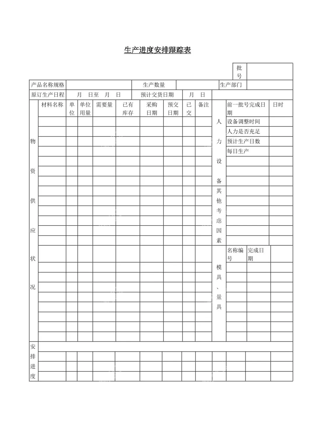这是一份专业实用的生产进度安排跟踪表,专为制造型企业、生产车间打造标准化生产管理工具,可用于记录产品批号、生产数量、原订日程、物料供应、人力设备等全链路生产相关信息,全方位助力生产管理人员高效完成生产进度跟踪与统筹管理,解决生产流程混乱、进度不清、物料脱节等常见生产管理痛点。这份正式的生产进度安排跟踪表采用清晰的黑白表格格式,结构规整、模块划分清晰,填写和查看都十分便捷,适配车间现场记录、办公室统筹复盘等多场景使用需求。表格顶部标注清晰的标题,右上角专门设置了独立的批号填写栏,方便生产管理人员快速按批号归档检索不同订单的生产信息,满足多批次产品同时生产的管理需求。整体表格按照生产管理逻辑划分为多个功能模块,表头区域可直接填写产品名称规格、生产数量、负责生产的部门,还能清晰标注原订生产日程与预计交货日期,让生产核心目标一目了然。表格左侧专门设置物资供应状况板块,可逐行记录不同材料对应的供应单位、单位用量、现有库存、计划采购日期等关键信息,帮助管理人员提前预判物料缺口,避免因物料断供耽误生产进度。表格右侧则涵盖人力设备调配记录、其他特殊考虑因素登记、模具量具管控以及完整的生产进度跟踪记录区域,从生产资源调配到每日进度更新都能实现一站式记录,真正覆盖生产全流程的管理信息记录需求,帮助生产团队把控生产节点、提高交付效率,是生产管理中不可或缺的实用工具。