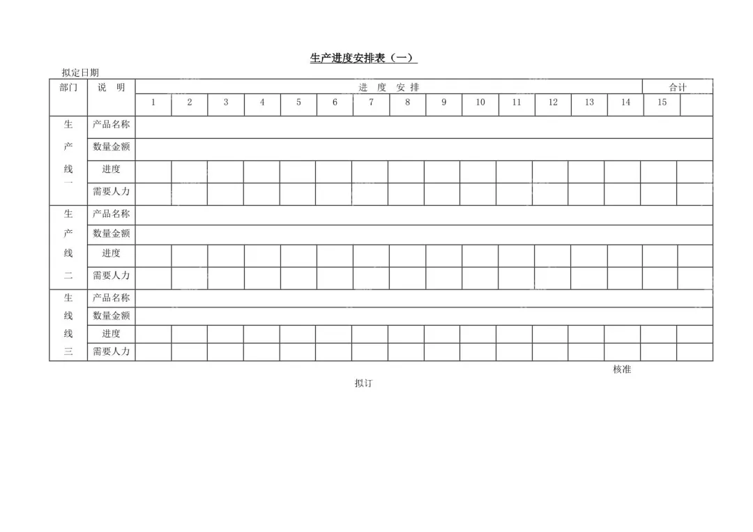 这份《生产进度安排表(一)》是生产型企业用于生产进度统筹管理的专业标准化工具,专门针对多生产线协同生产场景设计,能够帮助生产管理人员清晰梳理日常生产安排,高效完成生产计划落地,是生产车间管理中不可或缺的实用生产管理表格模板。这份生产进度安排表专门划分了生产线一、生产线二、生产线三三个独立板块,适配绝大多数中小制造企业多线并行的生产布局需求,每个生产线板块都设置了产品名称、数量金额、进度、需要人力四个核心统计项,既可以清晰记录每条线的生产品类,也能同步统计对应订单的产值规模,还能直观标注当前生产推进进度,提前规划匹配对应岗位的人力需求,覆盖了生产计划筹备阶段的所有核心管理维度。不同于笼统的生产计划表,这份生产进度安排表在顶部专门设置了1到15日的细化进度安排列,还预留了合计统计列,生产管理人员可以按日拆解生产任务,精准把控每半个周期的生产推进节奏,方便每日核对生产完成情况,及时调整产能分配。同时表格下方还预留了拟定日期、拟订人、核准人的填写位置,明确生产计划的权责划分,方便后续生产追溯和管理审核,适配正规制造企业的生产管理流程规范。对于中小制造企业来说,这份空白的生产进度安排表可以直接打印使用,也可以电子填写修改,不管是月度生产拆分,还是半月度生产调整,都能快速完成多生产线的进度统筹,帮助企业减少生产混乱、人力错配、进度延误等问题,提升生产管理效率,是非常实用的生产进度管理工具。