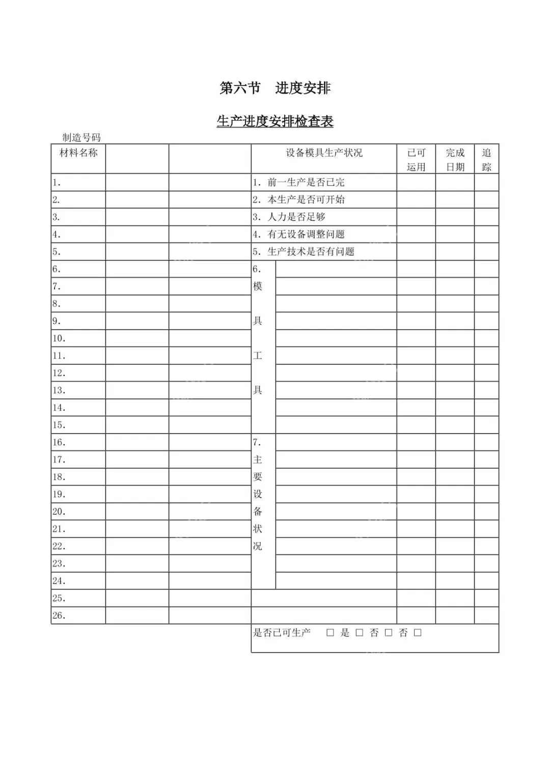 生产进度安排检查表,企业生产管理的高效工具在离散制造、批量生产等各类生产场景中,生产进度失控、前置准备遗漏、资源配置不到位是影响交付效率、增加生产成本的核心问题,一份专业规范的生产进度安排检查表,能够帮助生产管理人员系统性梳理全流程准备情况,精准把控生产节奏,保障订单按时交付。这份标准化的生产进度安排检查表,是企业生产进度管控场景下的实用管理工具,表格全称标注为“第六节 进度安排 生产进度安排检查表”,整体结构清晰,适配各类制造加工企业的日常生产管控需求。表格开头设置专属制造号码填写栏,方便生产管理人员对应具体生产订单快速归档检索,实现单订单全周期进度可追溯。表格主体采用多列多行的规范检查表格式,设置了材料名称、设备模具生产状况、已可运用状态、完成日期、追踪标记等核心栏目,能够清晰记录每一项生产资源的准备状态。检查表覆盖多维度生产进度追踪项:不仅包含前一生产环节是否完成、本批次生产是否可开始等流程衔接确认,还涵盖了人力是否足够、设备调整问题、生产技术问题等核心资源与技术排查,更针对生产核心要素设置了模具工具、主要设备状况等专项追踪项,真正实现从流程衔接、人力资源到生产硬件的全维度覆盖。在表格底部,还专门设置了“是否已可生产”的勾选栏,方便生产管控人员快速完成前置准备总结判断,一键确认生产启动条件。对于生产计划员、车间管理人员来说,这份生产进度安排检查表能够帮助避免遗漏生产前置准备项,提前发现人力缺口、模具故障、设备异常等影响生产进度的问题,从源头降低生产延误风险,帮助企业稳定把控生产进度,提升订单交付能力,是生产管理体系中不可或缺的实用工具。