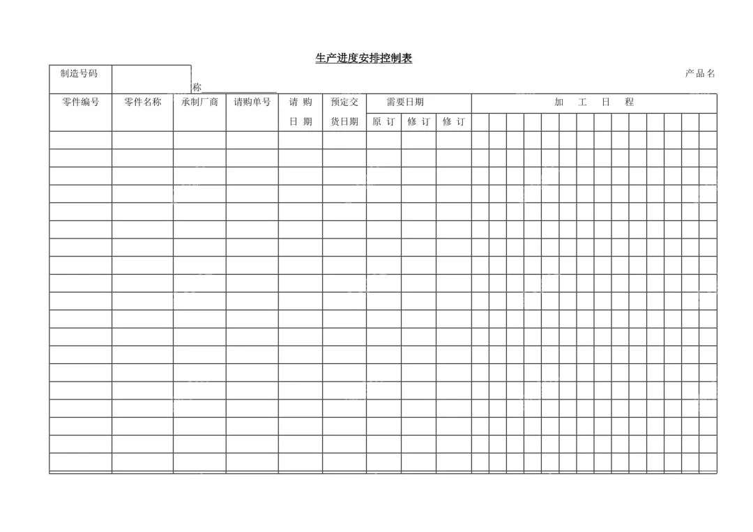 这是一款专业实用的生产进度安排控制表空白模板,专为制造加工行业的生产进度管控打造,能够帮助生产管理人员、跟单人员清晰记录零件全流程信息,精准跟进加工日程,高效推进生产计划落地,是工厂生产管理中不可或缺的实用工具。从模板结构来看,这款生产进度安排控制表的设计逻辑清晰,完全贴合生产跟单的实际需求。页面顶部居中位置醒目标注表格名称,右上角专门预留了产品名填写位置,方便管理人员快速区分不同产品线的生产进度,避免不同订单、不同产品的进度信息混淆。表格左侧区域设置了全套基础信息填写栏,可依次填写制造号码、零件编号、零件名称、承制厂商、请购单号、请购日期、预定交货日期,还专门设置了需要日期的原订与修订栏,能够应对生产过程中常见的交期调整需求,完整记录交期变更信息,避免信息偏差造成生产延误。表格右侧则设置了多列多行的加工日程填写区域,支持按日期或加工工序逐段跟进生产进度,管理人员可以清晰掌握每一个零件每一道工序的完成情况,及时发现生产滞后问题并快速调整。在实际生产管理场景中,这款生产进度安排控制表可以帮跟单员快速梳理多厂商、多零件的并行生产任务,无论是对接外部承制厂商的外包加工,还是管控工厂内部的生产流程,都能实现可视化的进度追踪,降低生产管控的沟通成本,减少漏单、延误等问题的发生,有效提升生产效率,助力企业按时完成交货计划。如果你正在寻找清晰易用的生产进度管控工具,这款结构完善的生产进度安排控制表模板可以直接套用,快速搭建规范的生产进度跟进体系。