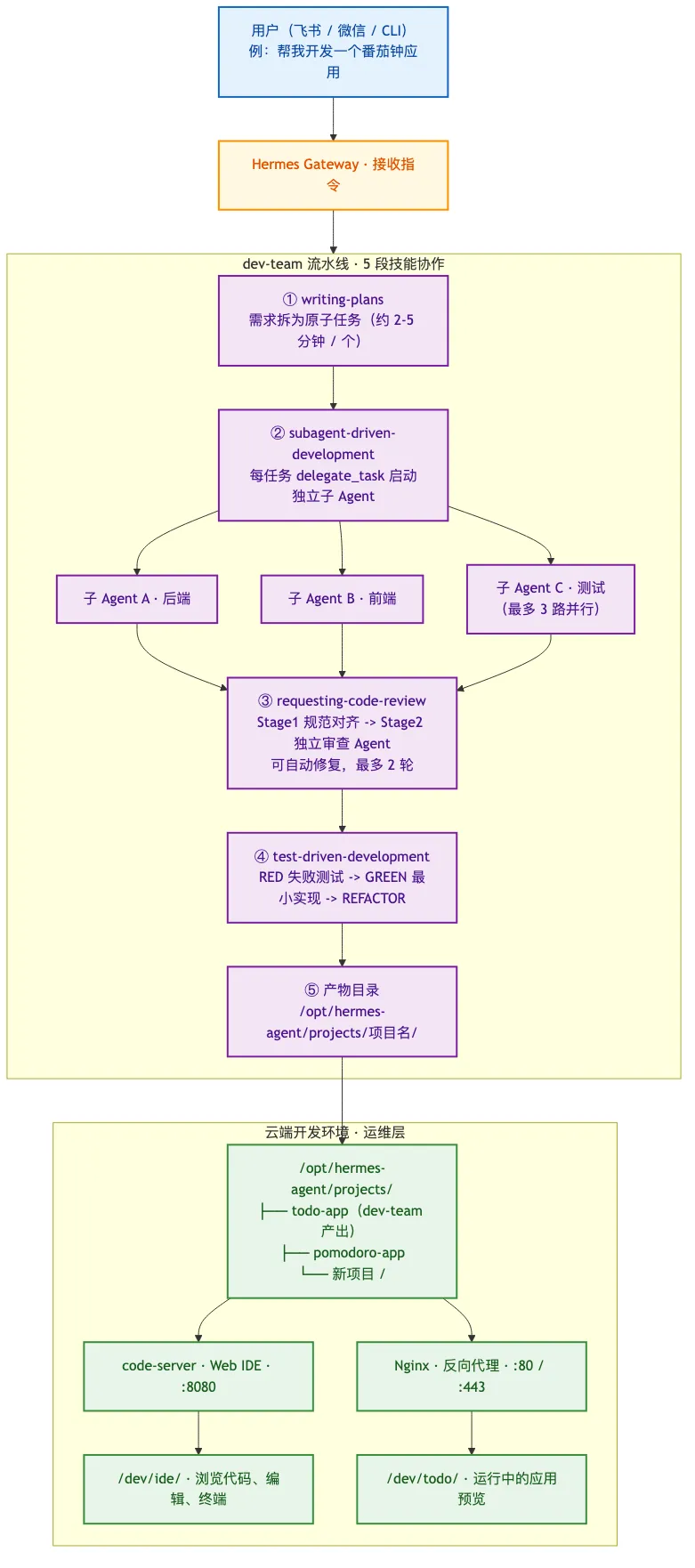 各段一句话(与知识库 hermes-dev-pipeline.md详解同步):