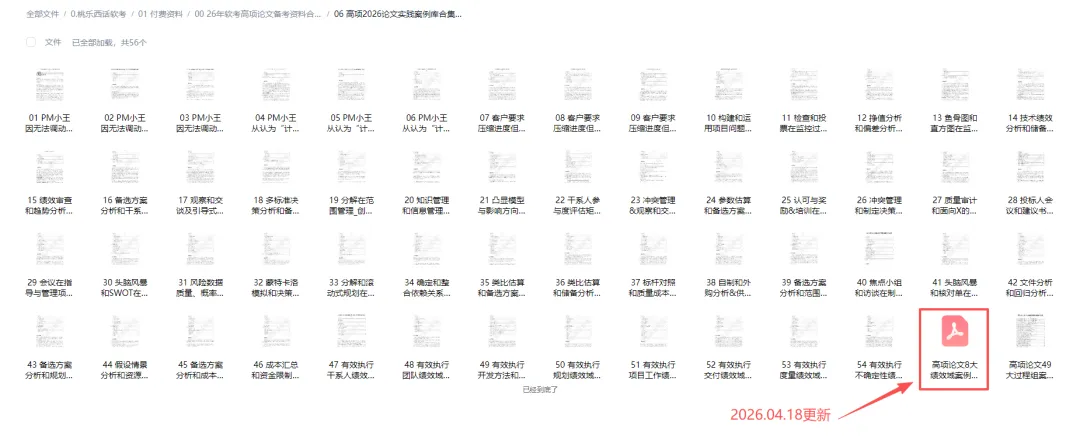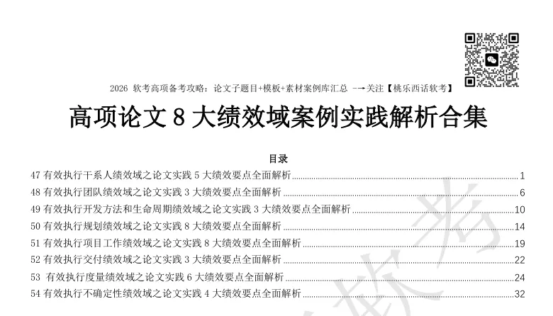 这份《高项论文8大绩效域案例实践解析合集》PDF版,是桃乐西学姐从清明节后开始花费了11天精心整理的案例资料库,可以充当高项论文素材,覆盖 8大绩效域(干系人、团队、开发方法和生命周期、规划、项目工作、交付、度量、不确定性),每个绩效域都按照“案例故事→不足分析→绩效域理解→规范流程→绩效要点应用”的结构编写,希望可以启发大家写出有深度、有逻辑、有实践感的高分论文。每个绩效域都从一个失败的项目案例讲起(如销售总监李明当项目经理)。阅读时,重点关注项目经理哪里做得不到位——这些“不足点”正是你论文中需要避免的坑,也是你可以用来制造“管理冲突”的素材。每个绩效域都提炼了3-8个核心绩效要点(如干系人绩效域的识别、分析、优先级排序、促进参与、监督)。理解这些要点,能帮你快速抓住该绩效域的论文得分点。这一部分是最值钱的实操内容。我以真实项目为背景,详细演示了如何一步步执行每个绩效要点(如用权力-利益方格排序干系人、用原型法降低模糊性、用燃尽图跟踪迭代)。你们可以直接借鉴其中的工具、模板和话术。● 背景 + 问题 → 参考案例故事中的“不足点”● 管理过程 + 工具应用 → 参考“流程优化”中的具体做法● 成效总结 → 从案例的“执行效果检查”中提炼价值建议先通读一遍,标记自己薄弱的绩效域,再结合自身项目经历,尝试用自己的话复述一个绩效域的完整实践。坚持这样练习,你的论文一定能体现出系统性的项目管理思维,而不仅仅是零散的知识点堆砌。【八大绩效域案例实践解析合集】可点击链接跳转阅读👇Okay~今天的分享的《高项论文8大绩效域案例实践解析合集_打印版V20260417》PDF电子版已经给大家更新同步到《2605高项论文备考资料包》里面了,大家可以按需下载,有任何问题可以联系桃乐西学姐获取最新的网盘链接🔗✔ 高项历史成绩49/57/30,54/44/51,目前三战备考中