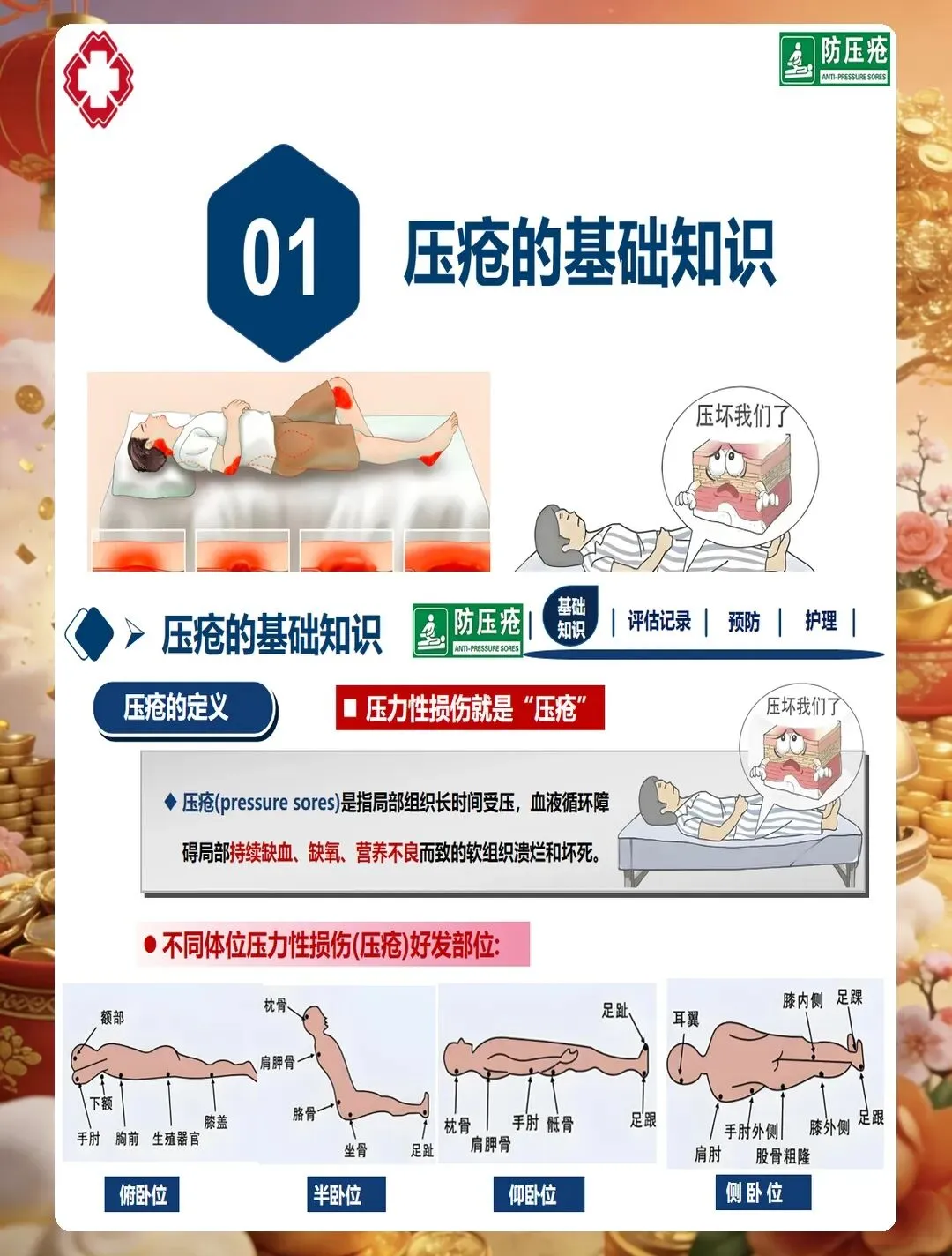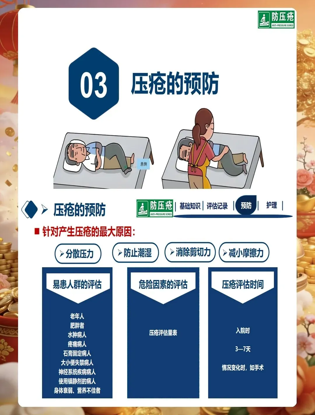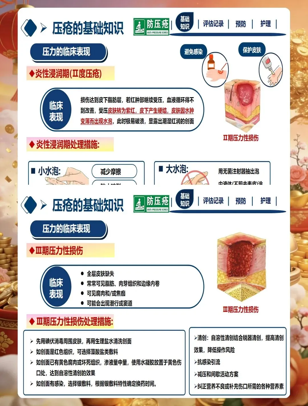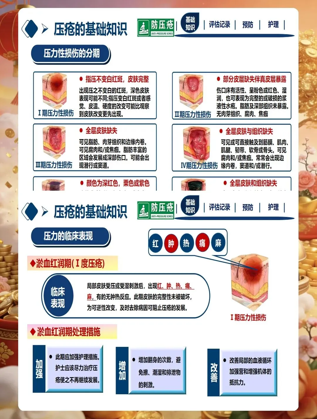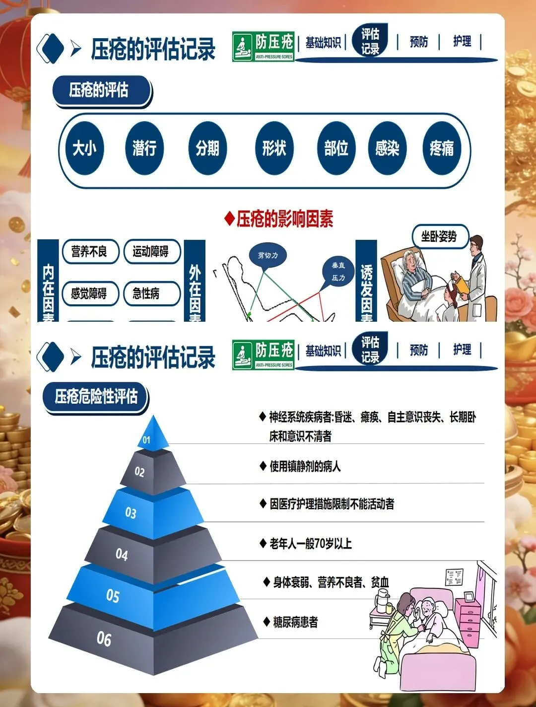 压疮,现规范称为压力性损伤,是临床护理中最需要关注的皮肤问题之一。按照2025版《国际压力性损伤预防和治疗临床实践指南》的定义,压力性损伤是由于长期或强烈的压力、或联合剪切力作用于骨隆突处,导致皮肤和(或)皮下组织局部损伤。风险评估是预防的第一道防线,目前临床上最常用的是Braden评分量表,从感知能力、潮湿程度、活动能力、移动能力、营养摄入、摩擦力与剪切力六个维度进行评估,总分6至23分,分数越低风险越高。评估时机很关键,入院后8小时内完成首次评估,病情变化时及时复评,高风险患者每班评估一次。
