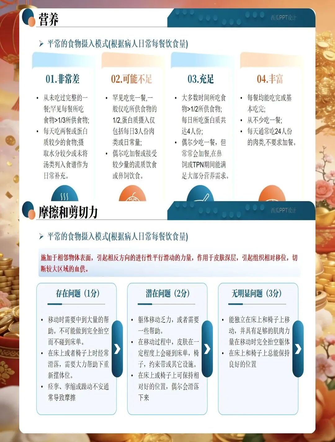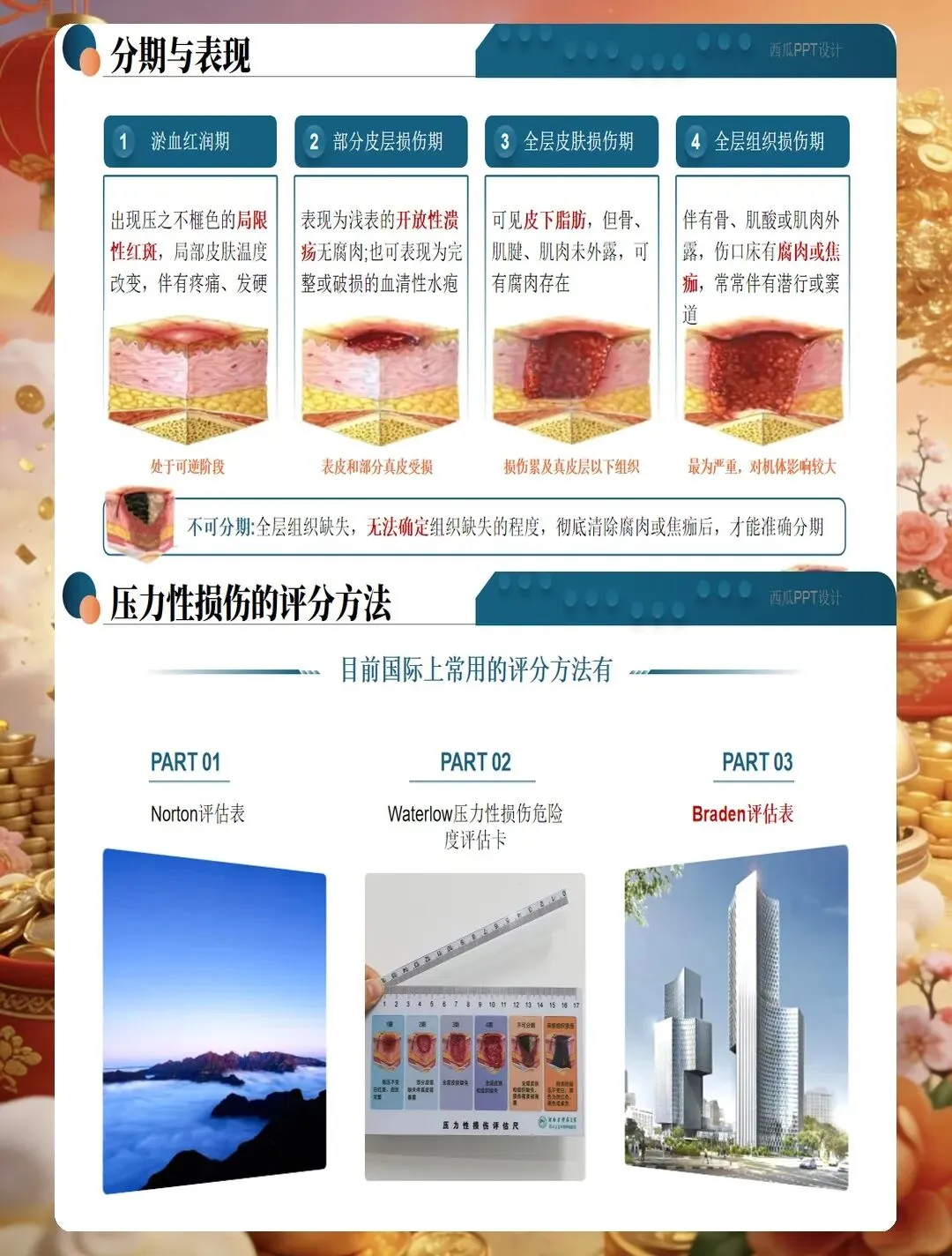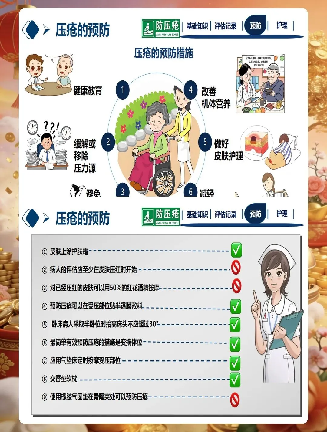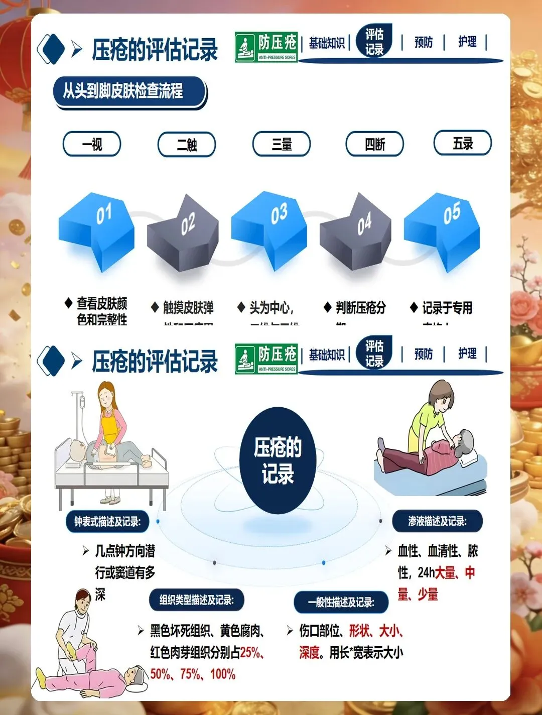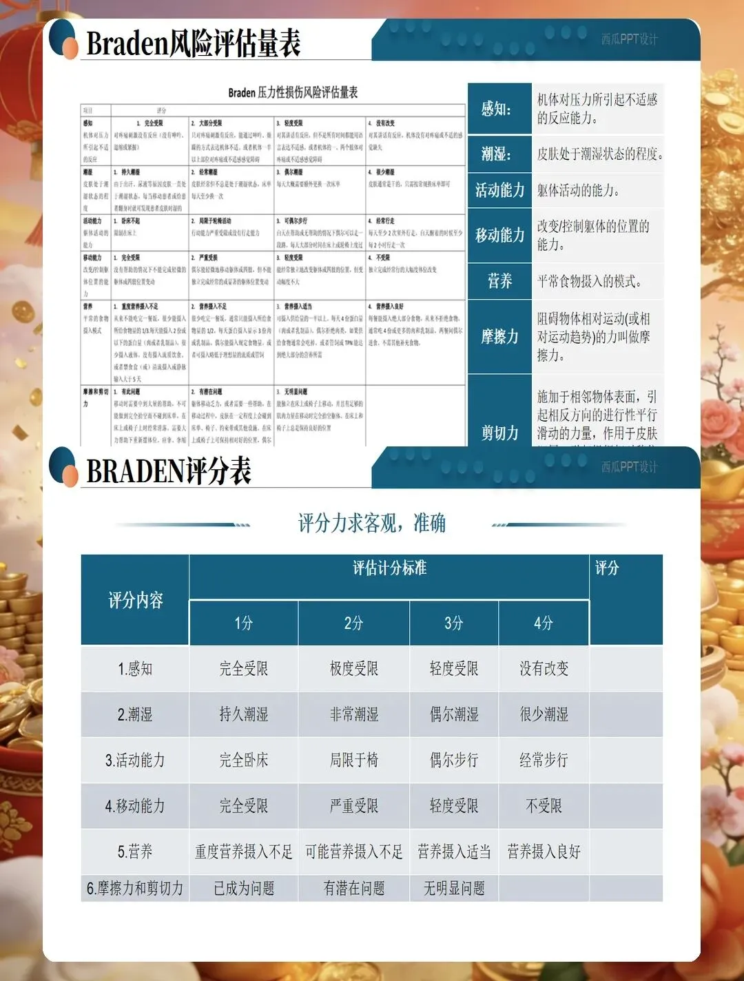 压疮,现规范称为压力性损伤,是临床护理中最需要关注的皮肤问题之一。按照2025版《国际压力性损伤预防和治疗临床实践指南》的定义,压力性损伤是由于长期或强烈的压力、或联合剪切力作用于骨隆突处,导致皮肤和(或)皮下组织局部损伤。风险评估是预防的第一道防线,目前临床上最常用的是Braden评分量表,从感知能力、潮湿程度、活动能力、移动能力、营养摄入、摩擦力与剪切力六个维度进行评估,总分6至23分,分数越低风险越高。评估时机很关键,入院后8小时内完成首次评估,病情变化时及时复评,高风险患者每班评估一次。