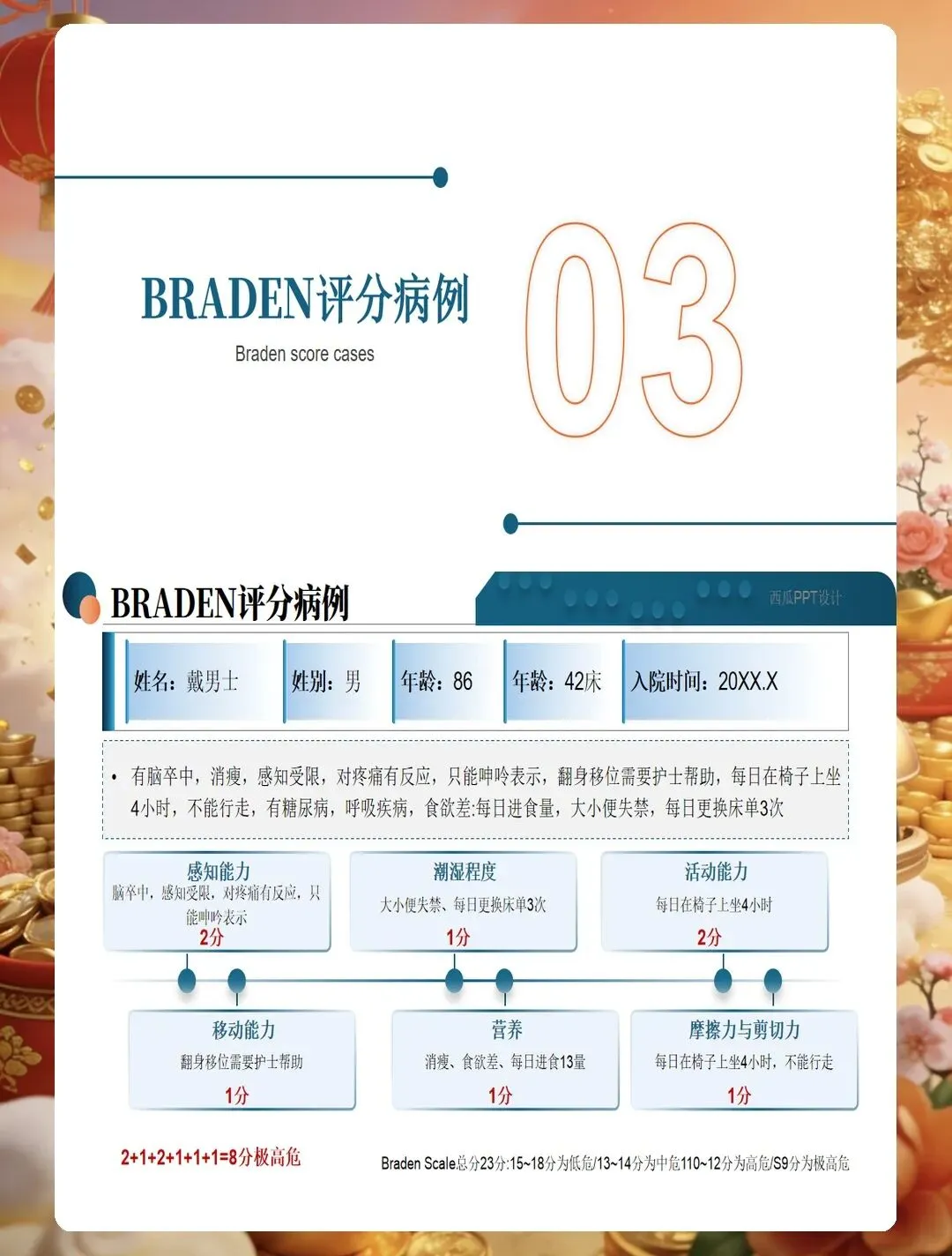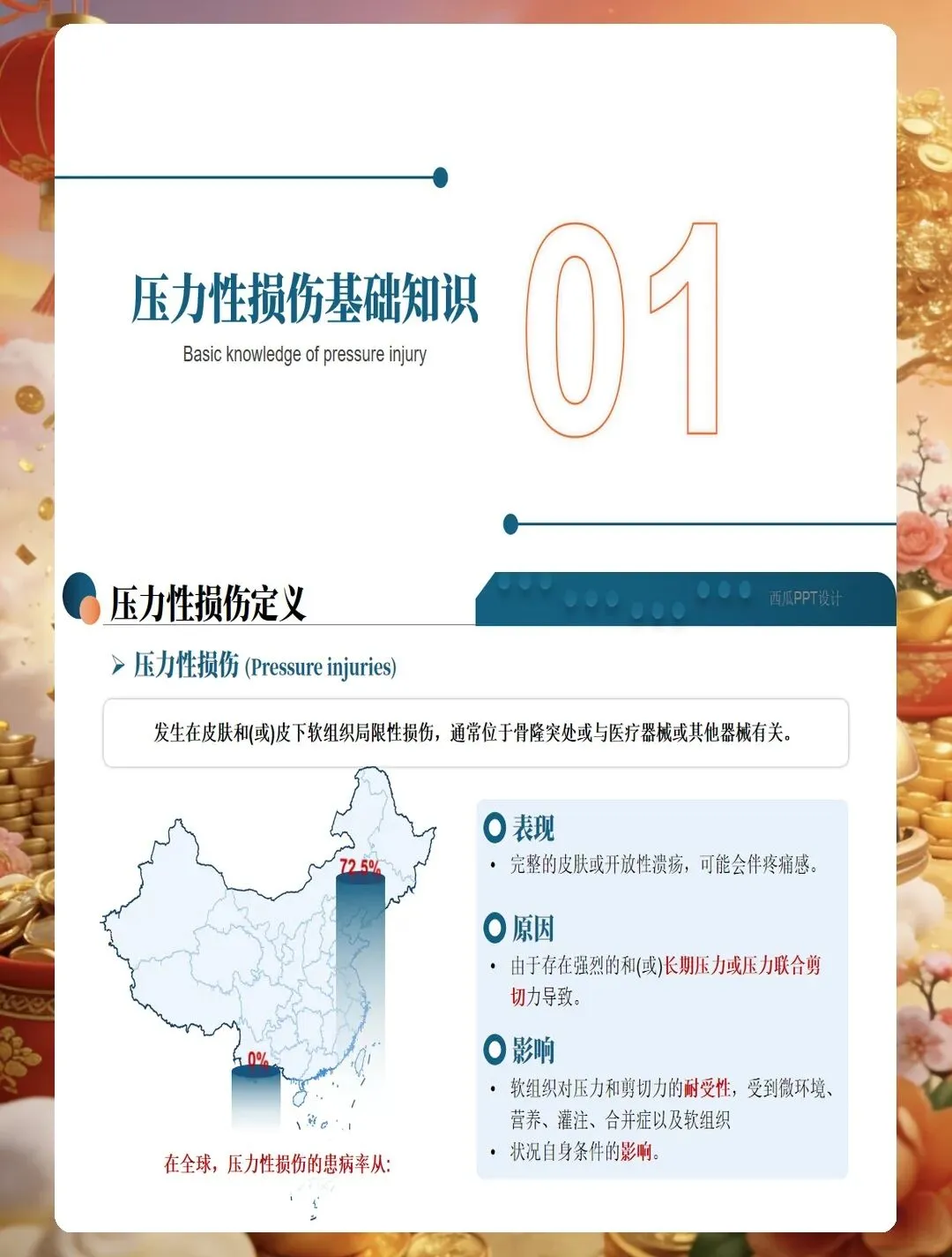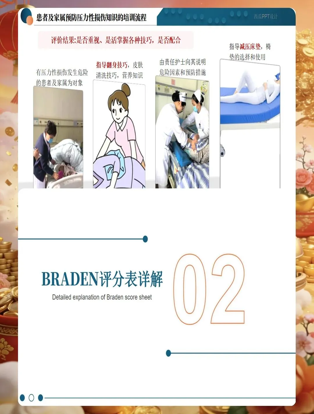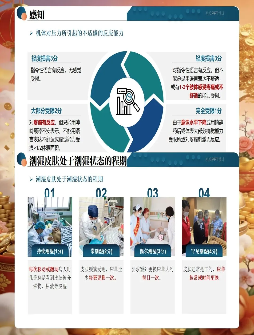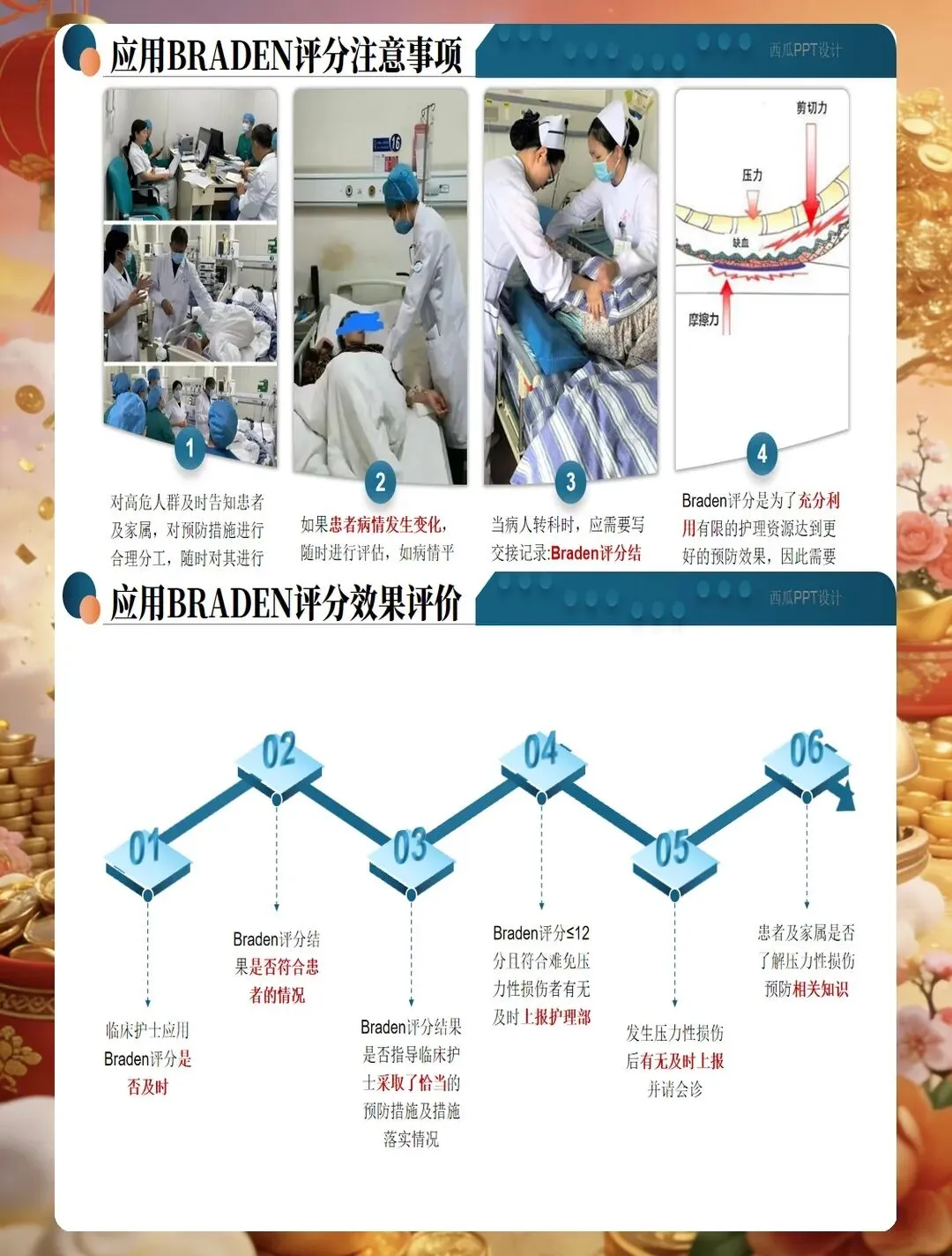压疮,现规范称为压力性损伤,是临床护理中最需要关注的皮肤问题之一。按照2025版《国际压力性损伤预防和治疗临床实践指南》的定义,压力性损伤是由于长期或强烈的压力、或联合剪切力作用于骨隆突处,导致皮肤和(或)皮下组织局部损伤。风险评估是预防的第一道防线,目前临床上最常用的是Braden评分量表,从感知能力、潮湿程度、活动能力、移动能力、营养摄入、摩擦力与剪切力六个维度进行评估,总分6至23分,分数越低风险越高。评估时机很关键,入院后8小时内完成首次评估,病情变化时及时复评,高风险患者每班评估一次。