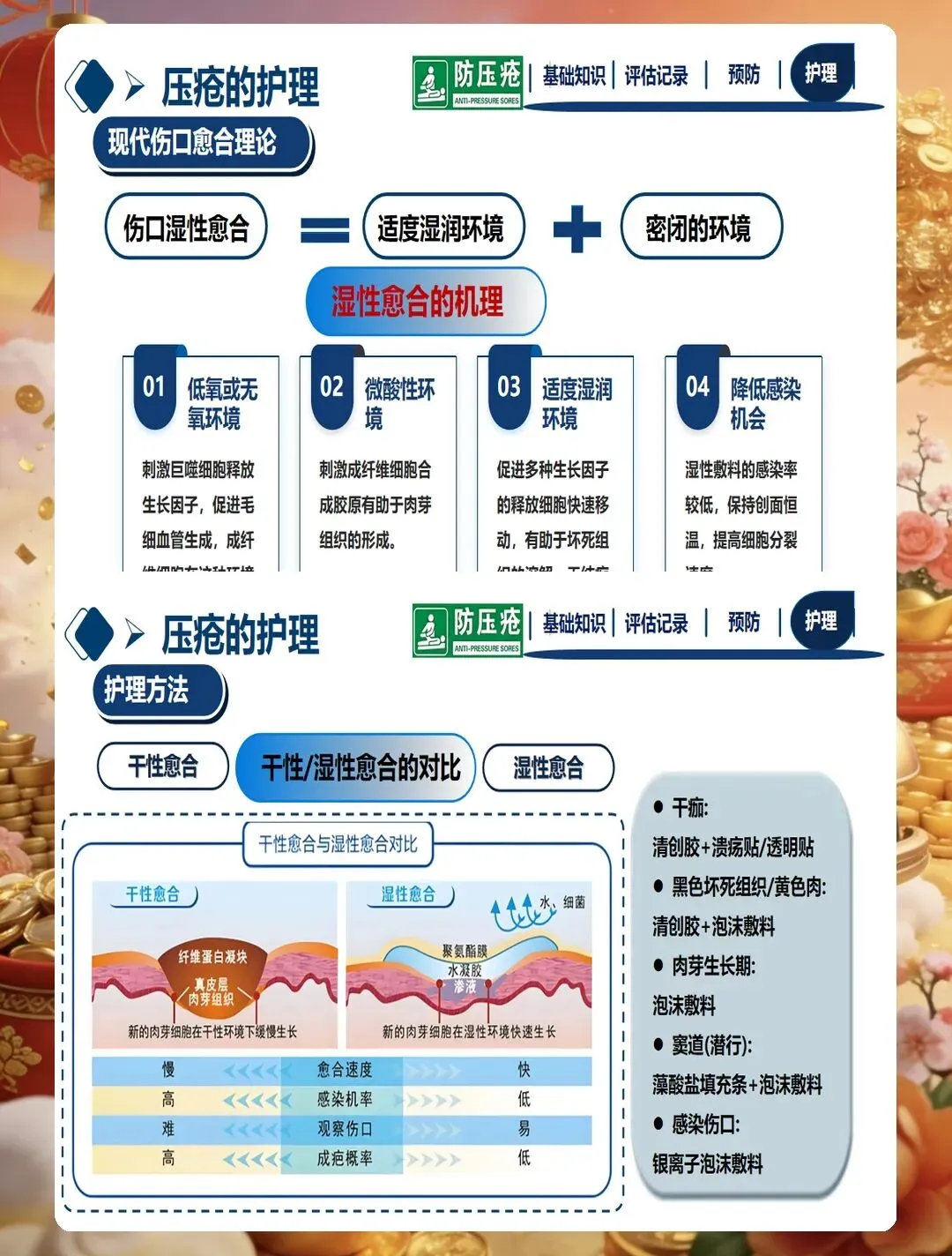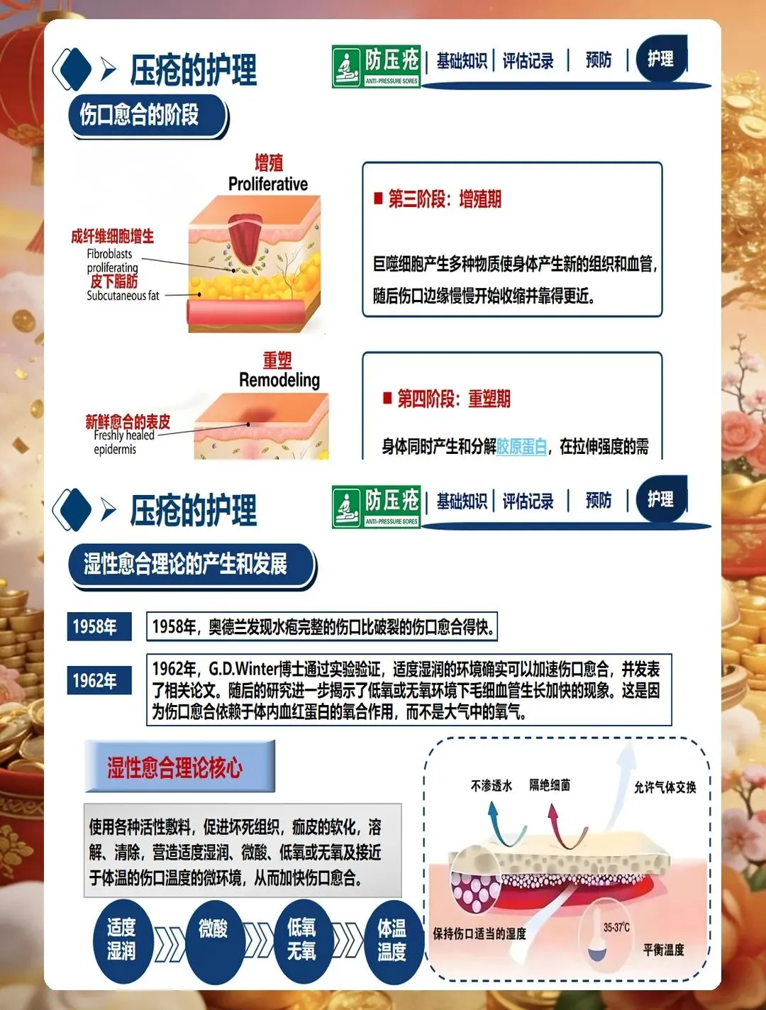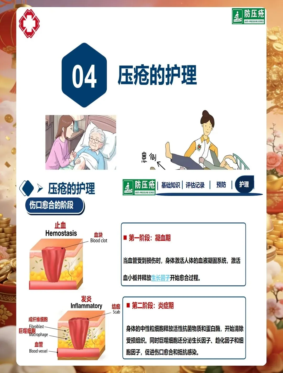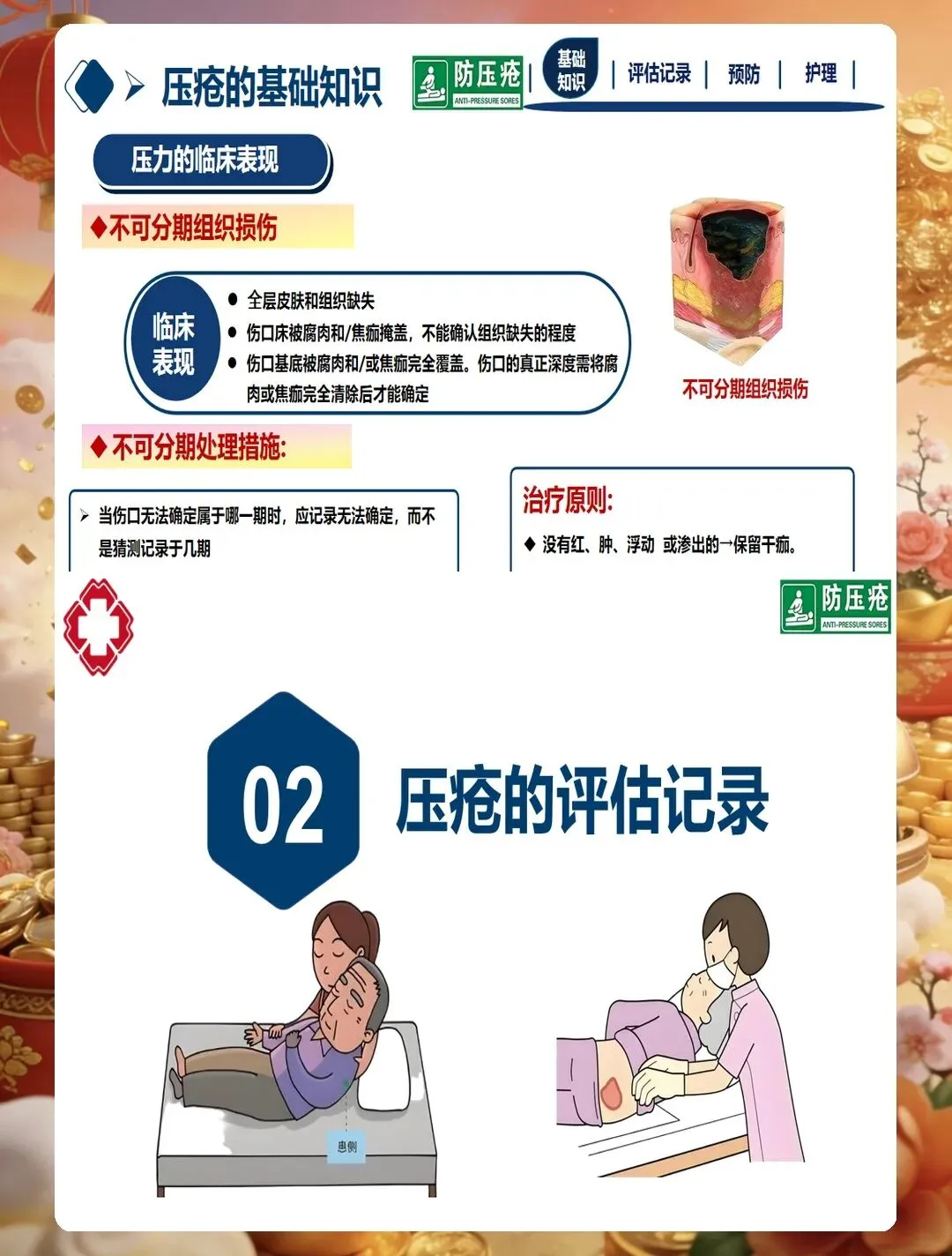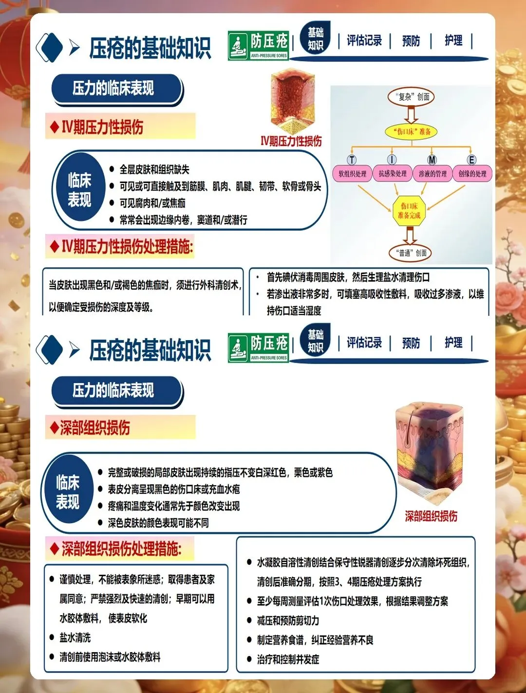 压力性损伤分为1期至4期、不可分期及深部组织损伤六种类型,不同分期护理重点不同。1期压疮表现为皮肤完整、指压不变白红斑,护理重点是彻底减压、保护皮肤,可使用水胶体敷料或泡沫敷料覆盖。2期压疮表现为部分皮层缺失,真皮层暴露,护理时要保持创面清洁湿润环境,根据渗出情况选择合适的敷料,避免使用刺激性消毒剂。3期和4期压疮损伤深达皮下组织甚至肌肉骨骼,需要由伤口专科护士或医生处理,必要时进行清创、抗感染治疗。护理过程中要动态评估创面愈合情况,记录伤口大小、深度、渗出液性状、创面基底颜色等,拍照留存便于对比。质量控制方面,科室要建立压疮上报制度,发生压疮后24小时内完成上报,护理部定期组织案例讨论,分析原因、制定改进措施。护士要掌握压疮预防知识,熟练运用评估工具,做到早识别、早预防、早干预,将压力性损伤发生率控制在最低水平
