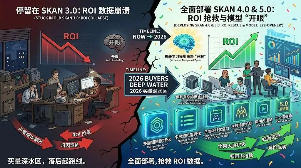 在 2026 年的 iOS 生态中,不要再指望能找回过去那种毫无保留的像素级归因了。但这也绝不意味着我们要彻底放弃 iOS 庞大的高净值市场!深度理解并部署 SKAdNetwork 4.0,是一场极其硬核的技术与业务逻辑的深度缝合战。通过巧妙利用三大时间窗口追踪长线价值,极其冷血地将业务核心漏斗映射进 Low/Medium/High 的粗粒度转化值中,你就能在苹果严苛的隐私帷幕下,强行抢救出指导大模型出价的核心数据。驯服 SKAN,就是驯服了后 ATT 时代 iOS 买量的终极财富密码!