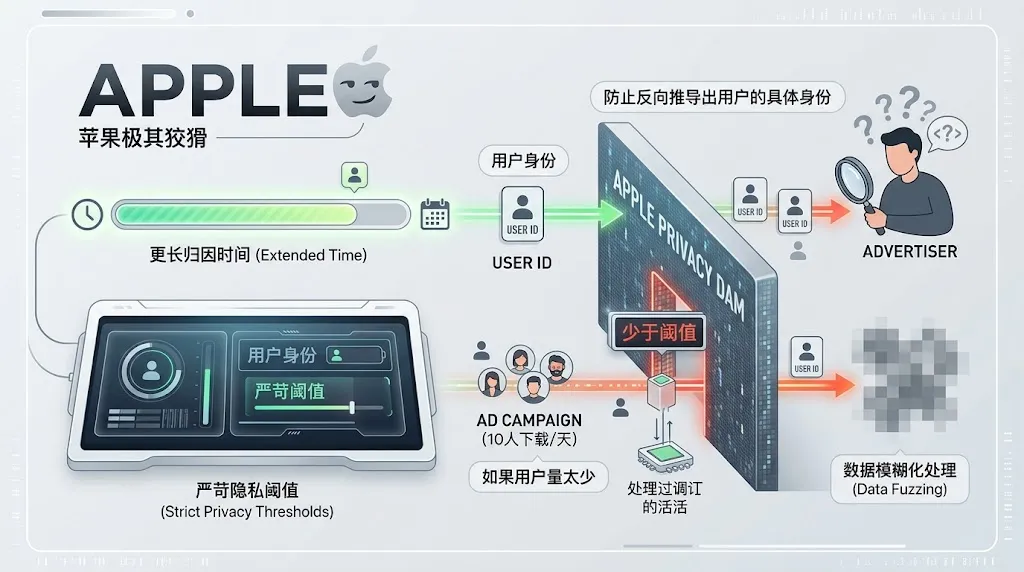 苹果极其狡猾。它虽然给了你更长的时间,但它为了防止你反向推导出用户的具体身份,设置了极其严苛的隐私阈值(Privacy Thresholds)。 如果一个广告计划带来的用户量太少(比如一天只有 10 个人下载),苹果认为你有可能会猜出这 10 个人是谁,于是它会对数据进行“模糊化处理”。