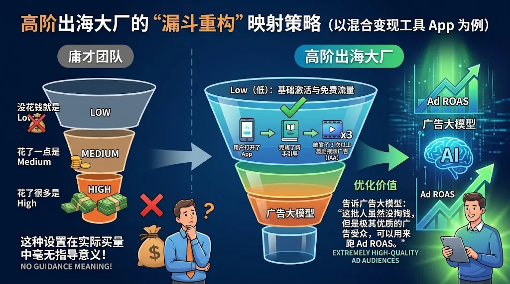 高阶出海大厂的“漏斗重构”映射策略(以混合变现工具 App 为例):
