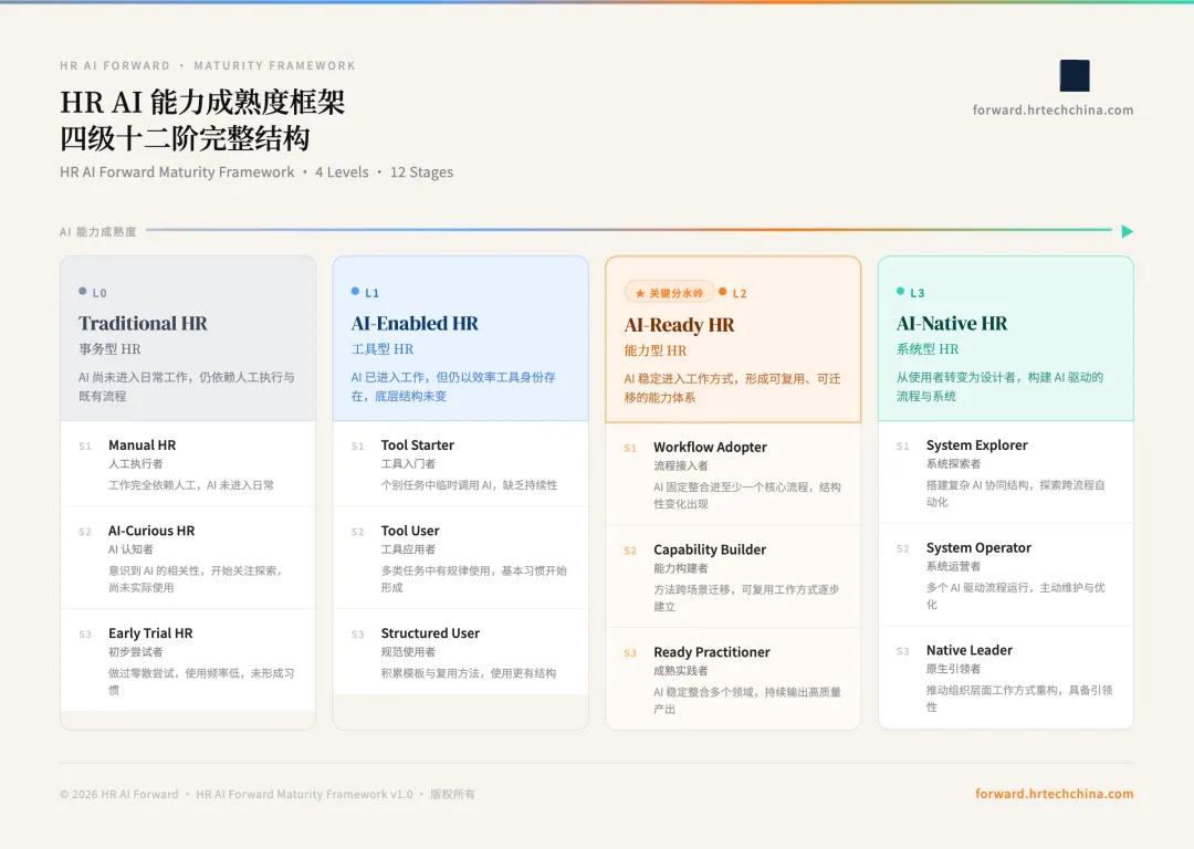 HR AI Forward 成熟度框架的建立,回应的是 AI 时代 HR 领域一个真实而紧迫的标准缺失问题。它以工作方式的实质变化为核心判断维度,以四级十二阶的结构提供精准的能力分层,以 L1 到 L2 的跃迁机制为核心洞察,为个人发展决策和组织能力管理提供了可落地的参照系。