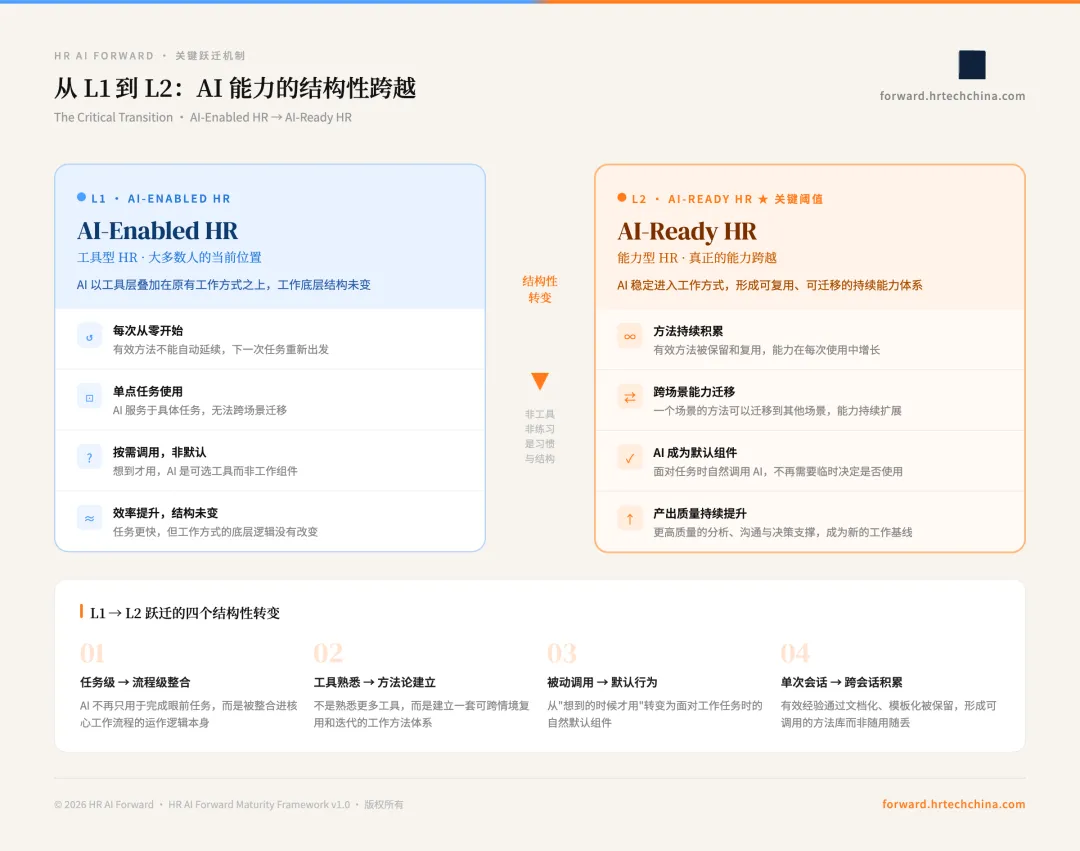 L1 停滞具有内在的心理机制:L1 的感觉是好的。有规律地使用 AI 带来真实的效率提升,“自己是会用 AI 的 HR”这种自我认知也有其合理性——但这种认知是不完整的。L1 没有提供的,是让 AI 能力得以复利积累的结构性基础:每一次 AI 使用基本独立,有效方法不能自动延续到下一次;在某个场景有效的方式,无法自然迁移到其他场景;能力存在于当下任务,但不会跨任务积累。