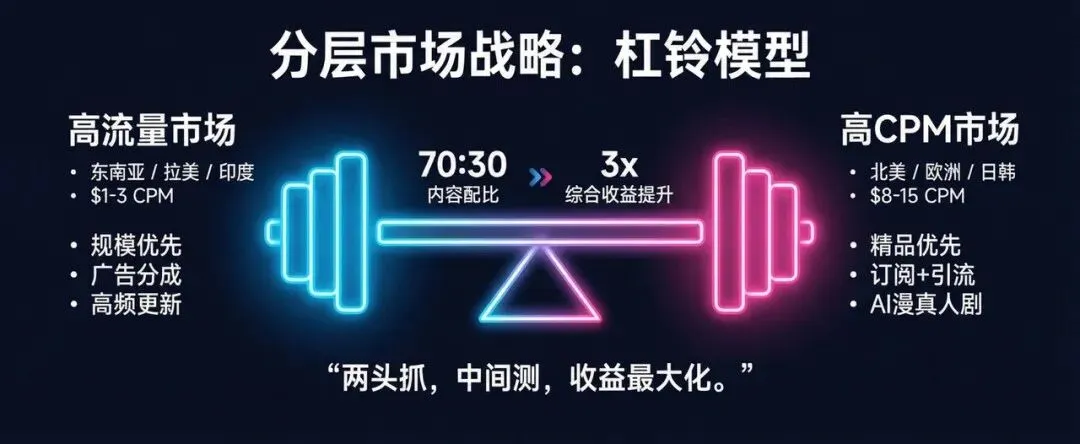 一头是高流量市场,像东南亚、拉美、印度,主打规模优先,靠高频更新和广告分成赚基础收益;另一头是高 CPM 市场,像北美、欧洲、日韩,主打精品优先,重点推 AI 真人漫剧,靠订阅和引流吃高溢价。
