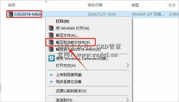 1.打开下载的CAD软件安装包,鼠标右击压缩包选择【解压到当前文件夹】。