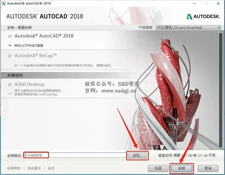 8.点击【浏览】设置CAD软件安装路径,建议安装到除C盘以外的磁盘,可自行设置,设置好安装路径后点击【安装】。