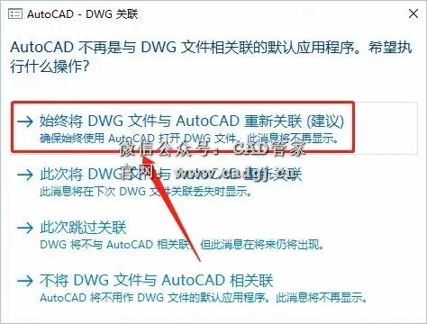 14.若出现如下图所示的界面,选择第一个【始终将DWG文件与 AutoCAD重新关联】,没有则忽略进行下一步。
