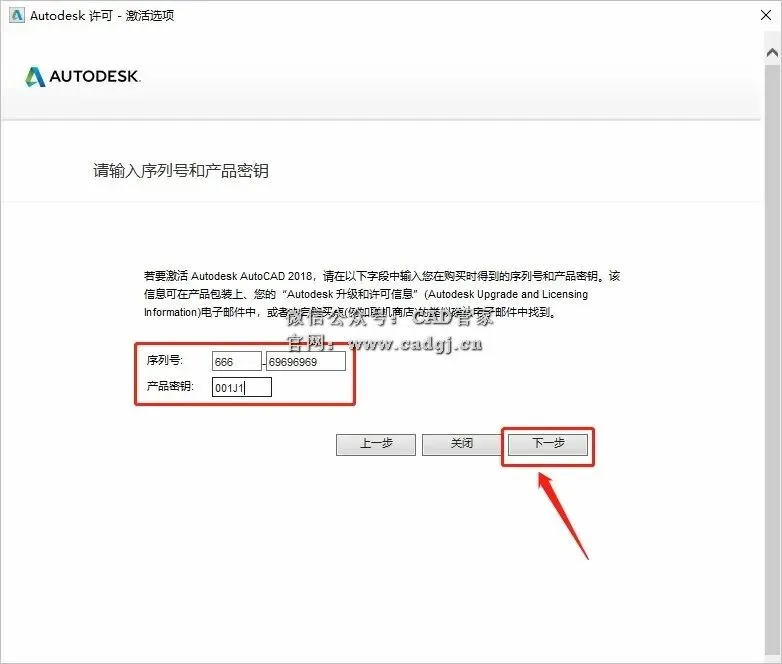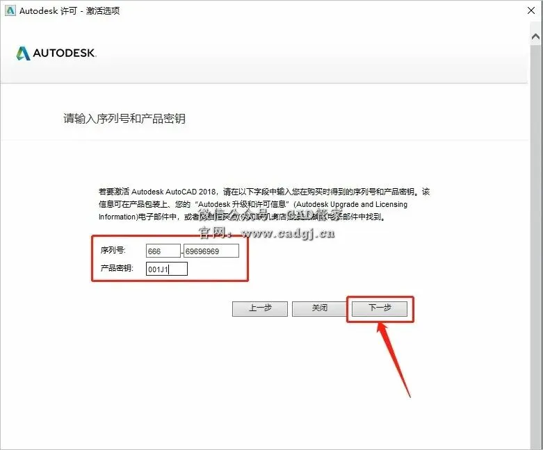 18.输入序列号:666-69696969,密钥:001J1,输入好后点击【下一步】。