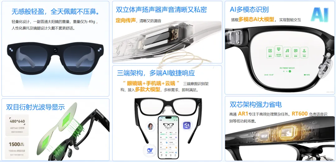多模态交互:双目衍射光波导显示,语音/手势操控,第一视角音视频实时记录。