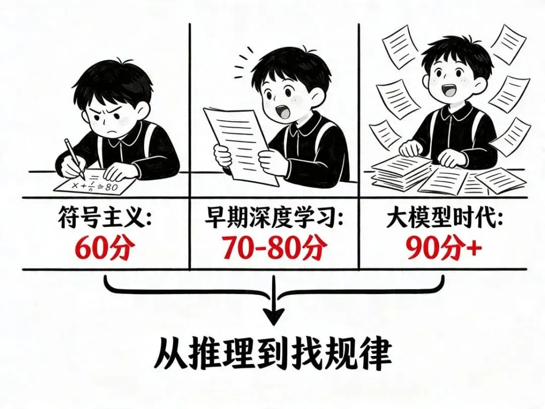 这就是早期 AI 的状态,学术界叫它符号主义。就是教会机器各种规则和公式,让它像人一样推理。听起来很靠谱对吧?但问题是这条路太难了,就像让一个普通学生通过死记硬背公式去考清华,基本没戏。