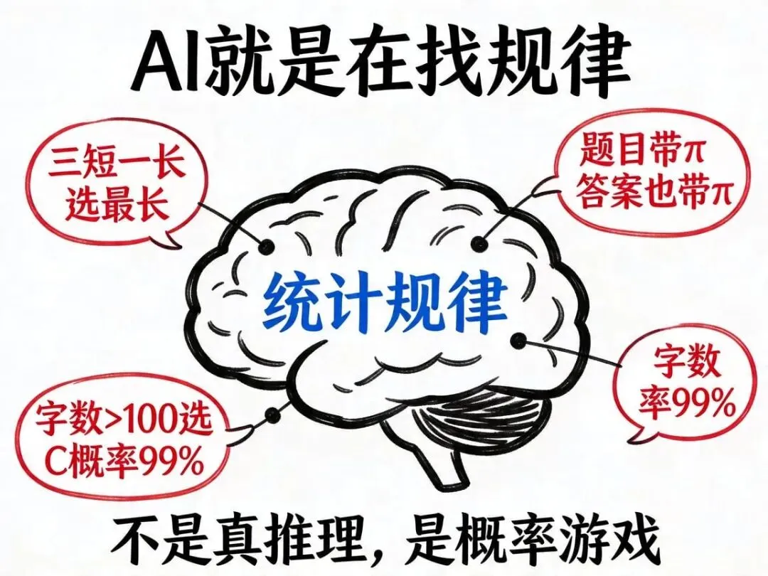 为什么会这样?因为它根本不是真的在理解和推理,它只是在海量数据里找到了某些高频模式,然后把这些模式套用到新问题上。
