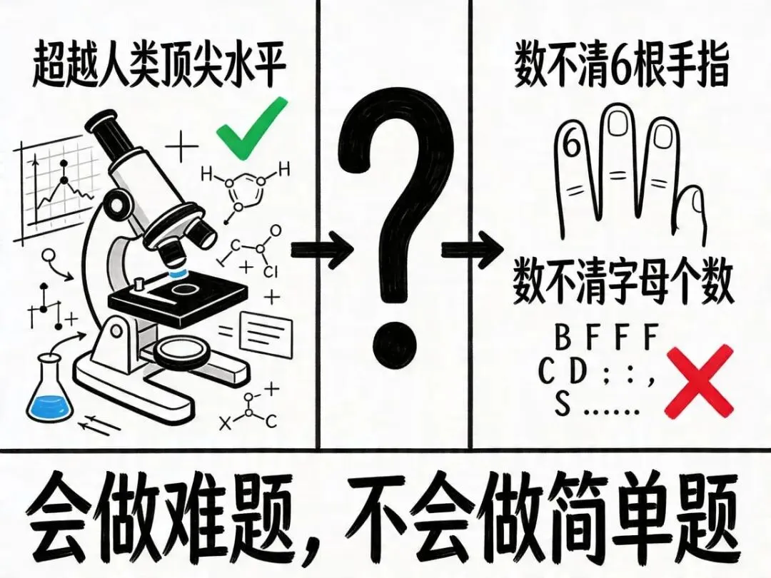 你让它数一个单词里有多少个字母,它会信心满满地给你一个错误答案。你给它出个简单的脑筋急转弯,它会认真思考半天然后拍着胸脯说错。
