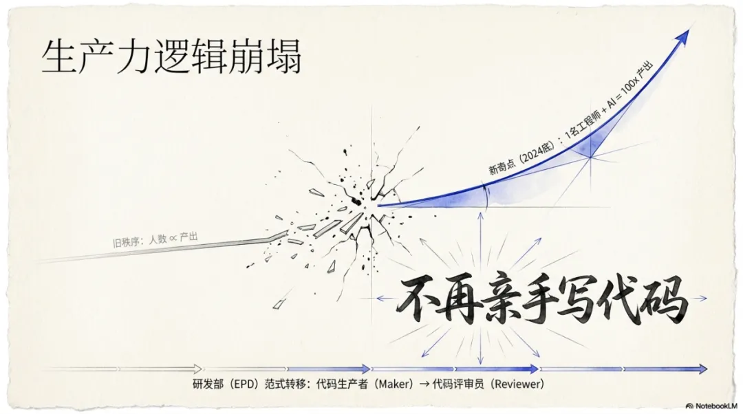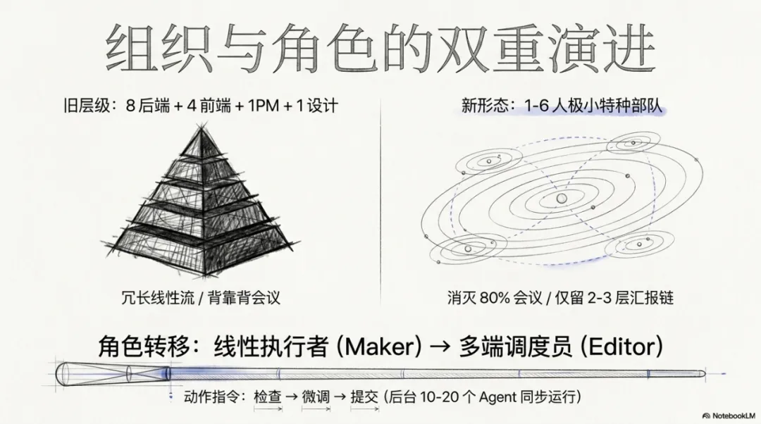 AI 工具让 1 到 2 名工程师的生产力提升 10 到 100 倍 组织结构从层级制转向 1 到 6 人的极小规模灵活小组