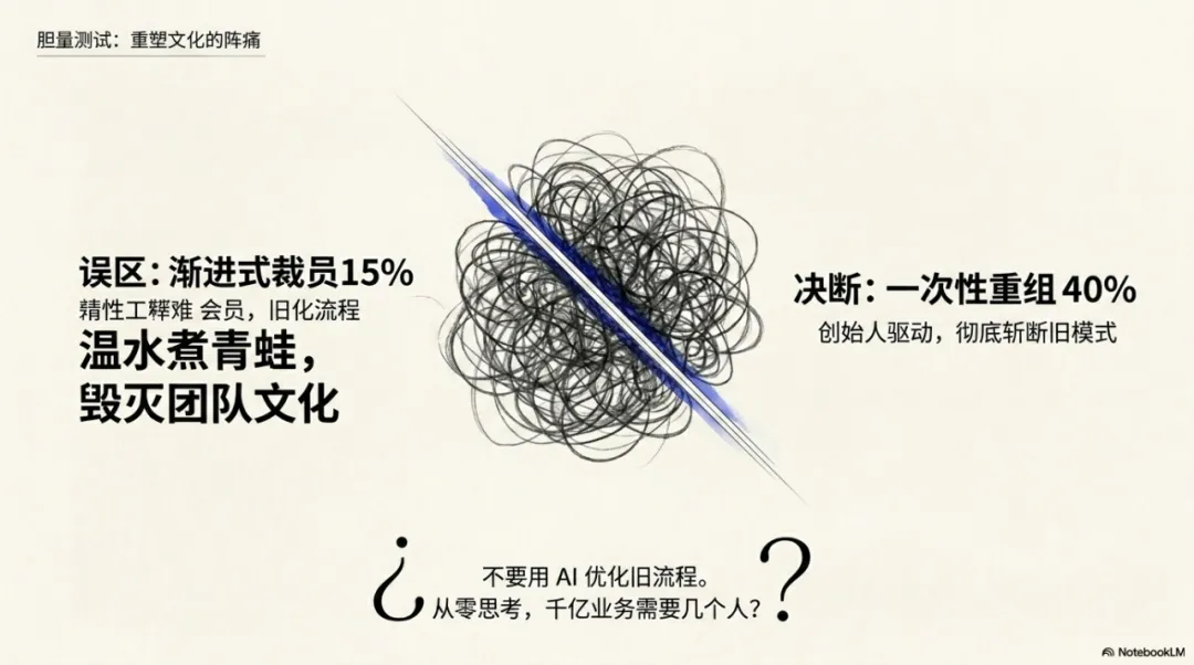 “如果你不够大胆,采取这种温水煮青蛙的策略,文化上对团队将是毁灭性的,因为员工总觉得下一场裁员随时会降临。” —— Owen Jennings