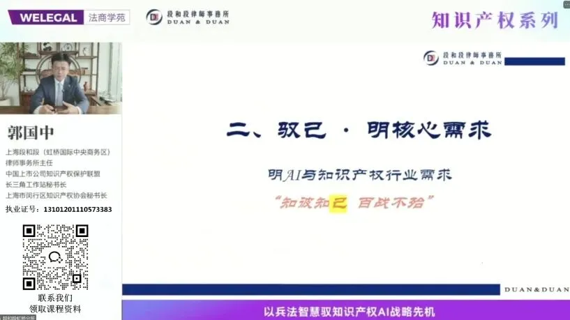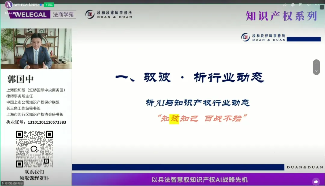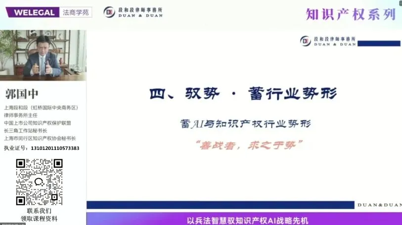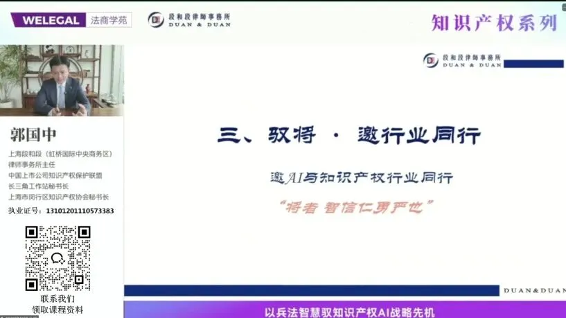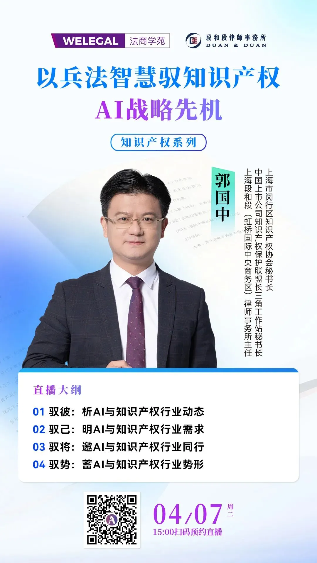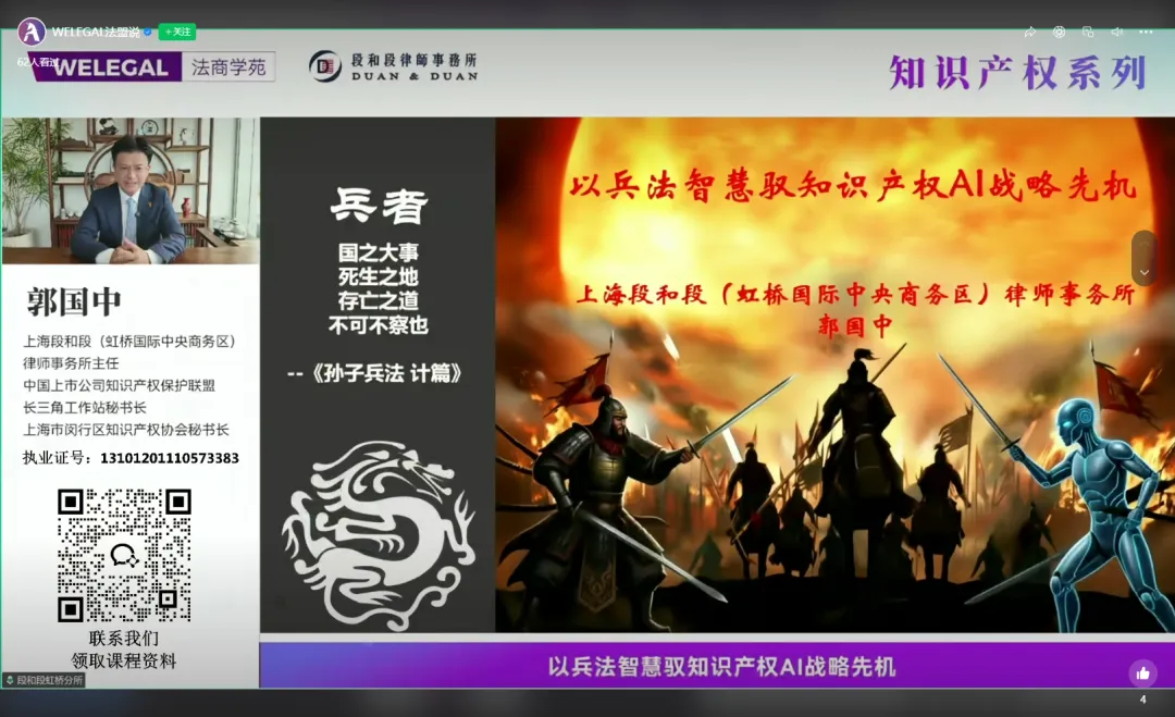 4月7日,上海段和段(虹桥国际中央商务区)律师事务所主任、中国上市公司知识产权保护联盟长三角工作站秘书长、上海市闵行区知识产权协会秘书长郭国中“作客”“WELEGAL法盟说”直播间,以《孙子兵法》为智慧框架,深入剖析AI时代下知识产权的战略应对之道。