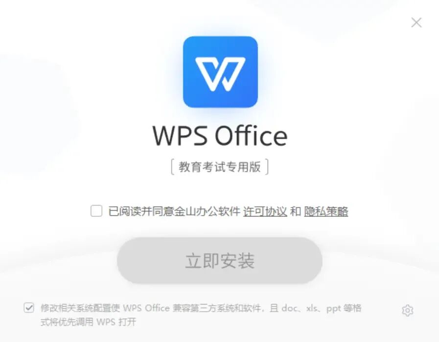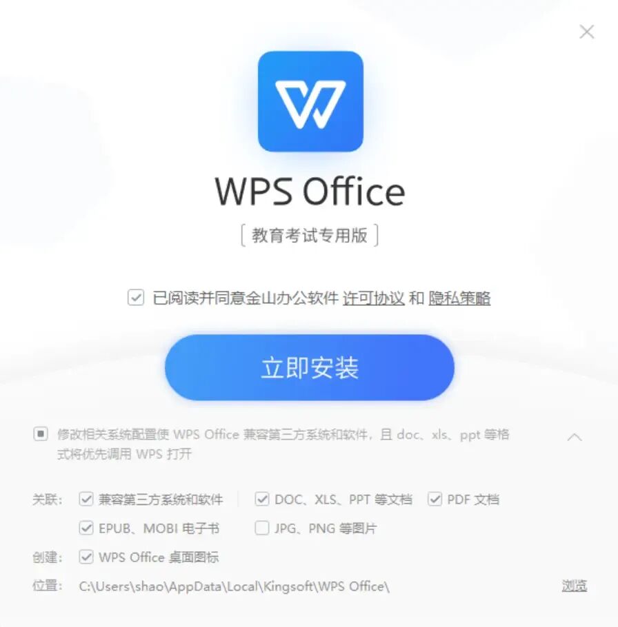 5、勾选已阅读并同意金山办公软件许可协议和隐私策略,单击设置按钮,不勾选JPG、PNG等图片,其他选项为默认设置,单击立即安装,等待几分钟后,WPS软件就会自动安装完成。