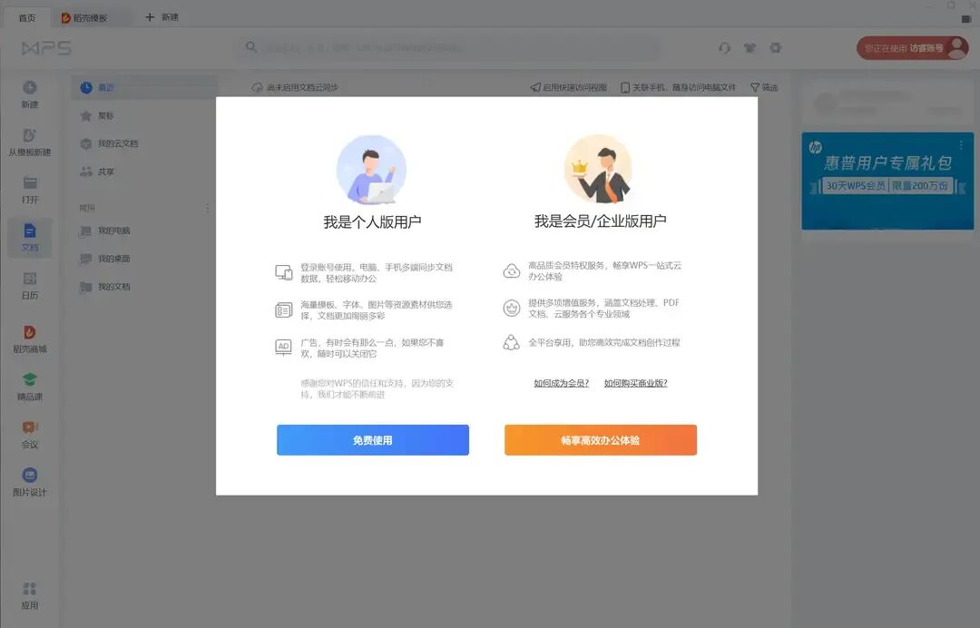 8、软件打开后,如果是个人版用户,单击免费使用;如果是会员/企业版用户,单击畅享高效办公体验,登录会员/企业账号。