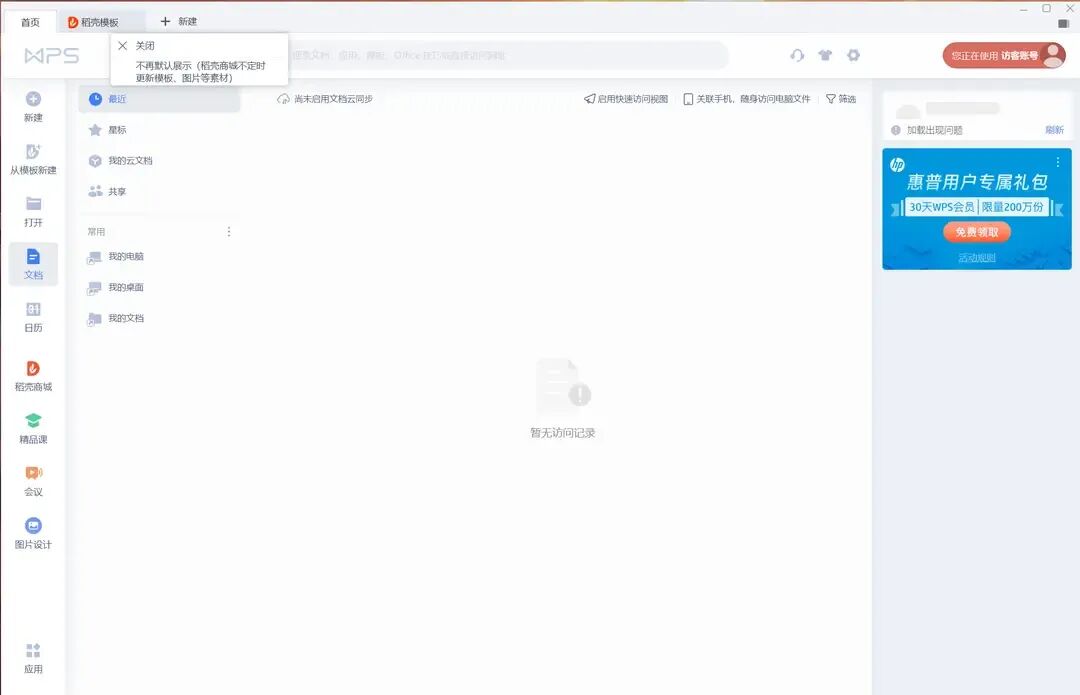 9、将鼠标指针移到稻壳模板,单击右键,再使用左键单击不再默认展示(稻壳商城不定时更新模板、图片等素材)。