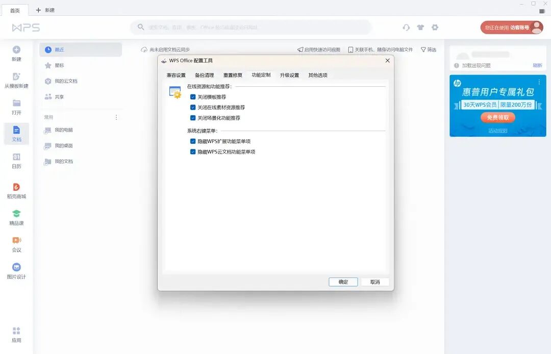 12、进到WPS office 配置工具页面,单击功能定制,将所有的选项均勾选。