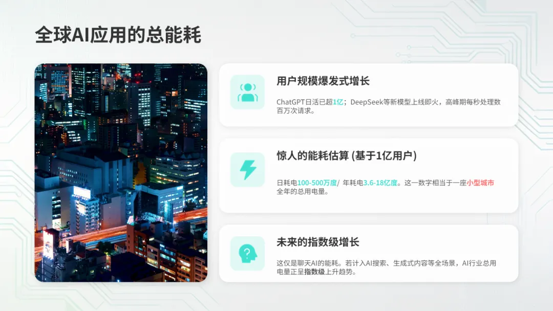 而这,还只是聊天。如果把AI搜索、AI图片生成、AI视频生成、AI语音助手全部算进去——AI行业的总用电量,正在以惊人的速度增长。