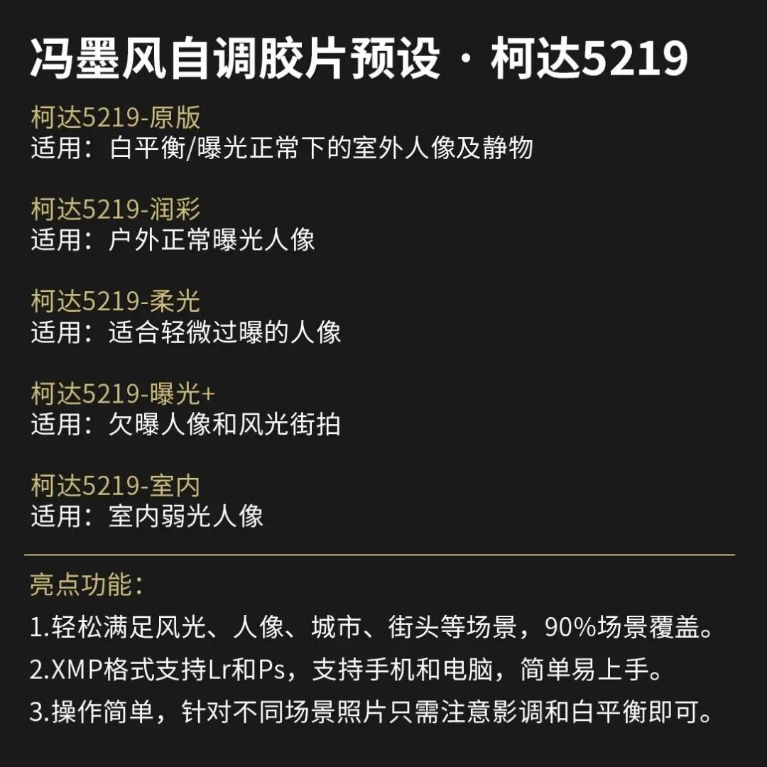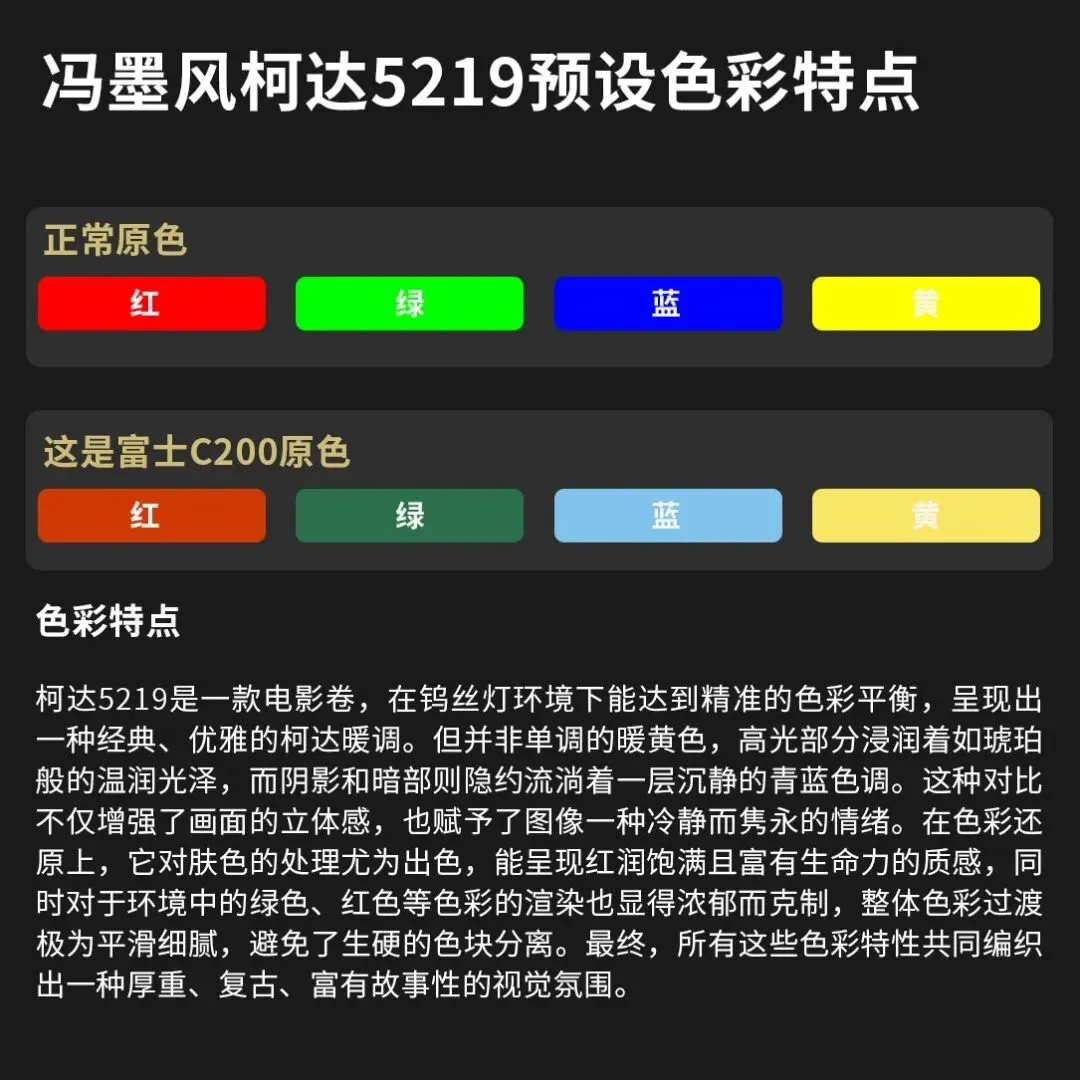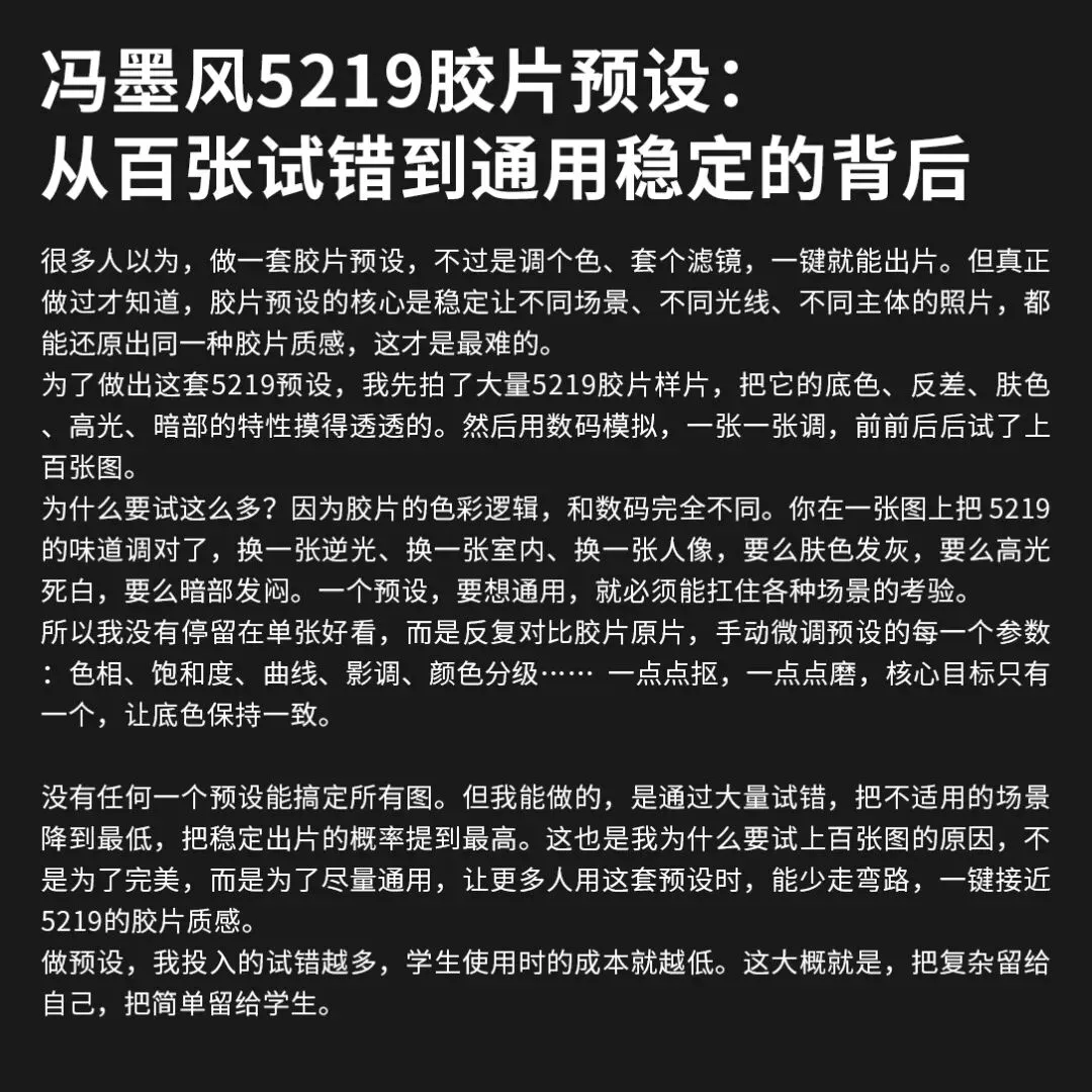 很多人以为做胶片预设就是调个色,一键出片。但真正做起来才明白,最难的是让它在不同场景、不同光线下,都能稳定还原出同一种胶片质感。为了做出这套5219预设,我拍了许多5219胶片样片,摸透它的色调、反差、肤色和高光暗部特性,再用数码一张一张调试,前后试了上百张图。