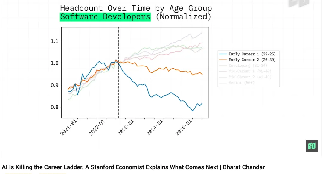 Chandar提出的愿景是用"职业网格"替代"职业阶梯"。传统的职业阶梯,是线性的、单向的——你在一个领域从底层开始,一级一级往上爬,每一步都依赖上一步积累的经验。这个结构,在技术变革加速的时代,风险极高。某个岗位一旦被AI接管,整条阶梯就可能失去意义。职业网格是不同的结构:多向可移动,横向跨界,纵向晋升,甚至斜向切入新领域。这种灵活性的前提,是职业转换的成本足够低——而AI若真正释放其学习辅助的潜力,职业间的知识迁移将变得前所未有的顺畅。当某个岗位在经济中的重要性上升,人们能够更快完成职业过渡,整个劳动力市场的韧性就会大幅提升。Chandar的研究给出的不是一个悲观叙事,而是一张需要重新定向的地图。年轻人的就业数据是早期信号,企业的激励错配是结构问题,AI的学习潜力是尚未兑现的资产。方向已经清晰:不是怎么对抗AI,而是怎么先一步站到能指挥AI的那个位置上。你所在的行业或岗位,目前更像是在被AI扩展,还是被AI压缩?以下是中英完整访谈来源:Stanford Digital Economy Lab嘉宾:Bharat Chandar(斯坦福数字经济实验室经济学家)时长:15分41秒编译:硅谷大脑 · Silicon Valley Brain00:00We're seeing that the jobs that are more exposed to AI, the young workers in those jobs are seeing 16% slower employment growth. So that's pretty large. The structural change in AI capabilities that are impacting the labor market, that's not going to be a temporary change. If we really unlock AI's capabilities for helping people learn, it could be much easier to switch between different professions. So I'm really hopeful that we end up somewhere closer to a career lattice that works for workers as opposed to a career ladder where there's much more risk about this technological change.我们观察到,在那些高度暴露于AI的岗位上,年轻员工的就业增速放缓了16%——这个数字相当显著。影响劳动力市场的AI能力结构性转变,不会只是一次暂时的波动。如果我们真正释放AI在辅助学习方面的潜力,职业间的跨界转换将变得容易得多。我非常期待,最终我们能走向一种"职业网格"——对劳动者更友好的结构——而不是停留在充满技术变革风险的传统"职业阶梯"之上。I'm Barat Chandra. I'm an economist at the Stanford Digital Economy Lab and I study how AI is impacting work. I would say over the past year and a half or so, I do feel like one of the most important questions in labor economics today is about AI's impact on the labor market. Once I really started using the tools more and understood their capabilities, that became the focus of my research agenda because it felt like one of the most important questions impacting society potentially in the future.我是Barat Chandra,斯坦福数字经济实验室的经济学家,专注研究AI对工作的影响。过去一年半左右,我愈发感受到:AI对劳动力市场的冲击,已经成为当今劳动经济学中最核心的议题之一。当我真正深入使用这些工具、理解了它们的能力边界之后,这一方向就成为我研究议程的核心——因为它很可能是未来影响整个社会最重要的问题之一。I released a study with my collaborators Eric Bolson and Ryu Chen. We studied how jobs were changing in jobs that were more exposed to AI versus less exposed to AI, and we were tracking millions of workers across the United States using data from a payroll company called ADP. One of the key findings there is that overall we were not seeing major differences in employment changes for jobs that were more and less exposed to AI. However, when we focus on young workers, we do see more of a divergence there where the jobs that are more exposed to AI, such as software development, customer service, more administrative roles, we were seeing employment declines and jobs that were less exposed to AI, we were still seeing some continued growth and employment. And for more experienced workers as well, we were still seeing employment growth that was pretty much on trend.我与合作者Eric Bolson和Ryu Chen共同发布了一项研究。我们利用美国薪酬管理公司ADP的数据,追踪了全美数百万名劳动者,对比分析高AI暴露岗位与低AI暴露岗位的就业变化。核心发现之一是:从整体来看,两类岗位在就业变化上并无显著差异。然而,当我们聚焦年轻劳动者群体时,分化就明显出现了——软件开发、客户服务、行政类等高AI暴露岗位的年轻员工,就业出现下滑;而低AI暴露岗位仍保持一定增长。对于经验丰富的员工而言,就业增长则基本维持在正常轨道上。03:00We're seeing that the jobs that are more exposed to AI, the young workers in those jobs are seeing 16% slower employment growth. A lot of people just starting off in their careers and they're finding it a hard time in doing that. And the reason we chose the canaries and the coal mine title is I think consistent with that view. We want to be tracking these outcomes because we think they could be indicative of potentially future transformative impacts of AI. How much of this is being driven by AI and how is that going to change going forward? We can't be sure whether this is just temporary change in the economy or if it's a structural change being driven by AI.高AI暴露岗位上的年轻员工,就业增速放缓了16%。大量刚刚踏入职场的年轻人,正在经历入门的艰难。我们之所以以"煤矿里的金丝雀"为标题,正是呼应了这一判断——我们需要持续追踪这些数据,因为它们可能预示着AI未来更深层的变革性影响。这场变化究竟有多少是AI驱动的?未来又将如何演变?我们目前尚无法断定,这只是经济层面的暂时波动,还是AI主导的结构性转变。Now, we did test some of the