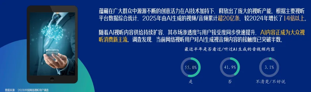 不同于往年AI作为前沿概念被提及,今年第十三届中国网络视听大会的议程设置、嘉宾发言均围绕AI展开,网络视听行业发展的机遇与挑战也与AI深度关联。AI已成为网络视听行业的基础支撑要素,是所有从业者必须适应的行业发展新底色。