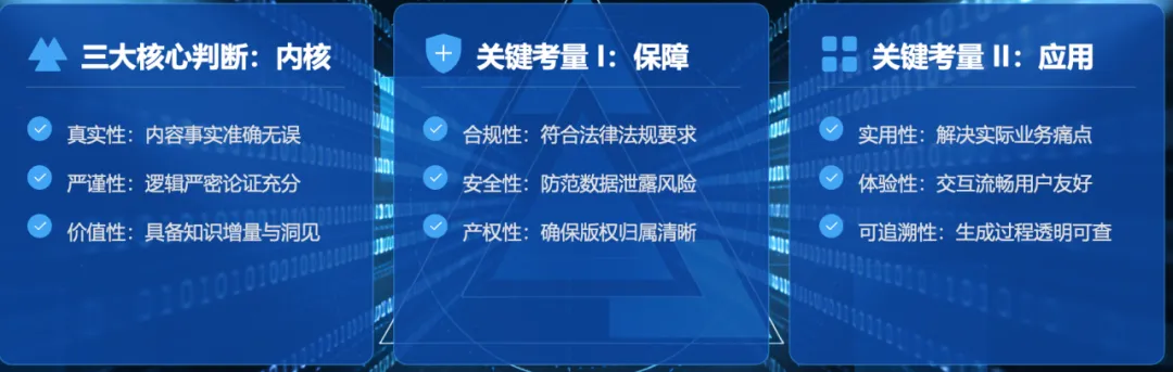 针对训练数据侵权、肖像声音盗用、像素级抄袭等层出不穷的新问题,大会正式发布《AIGC内容品质九维评估体系》。该体系围绕真实性、逻辑性、价值性三大核心判断,从合规性、安全性、产权性、实用性、体验性、可追溯性六个关键维度建立量化指标,明确了AIGC内容的基本准入标准与精品评价要求。