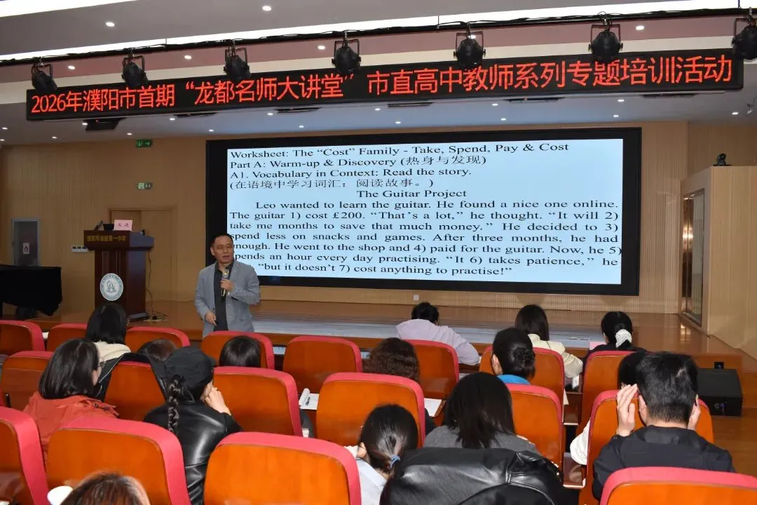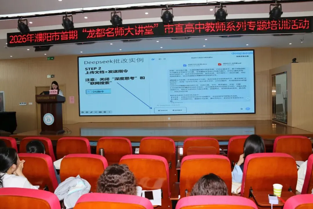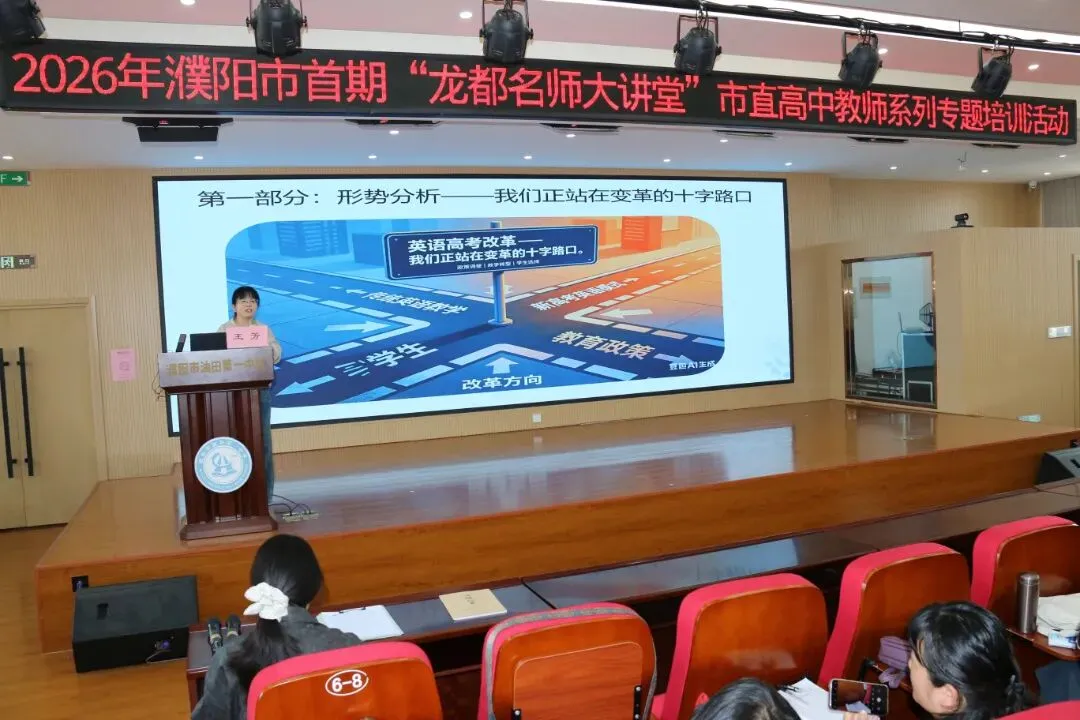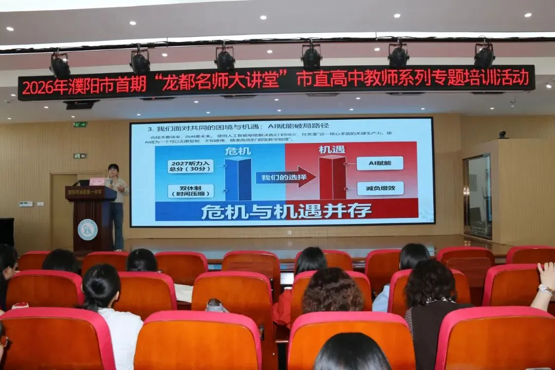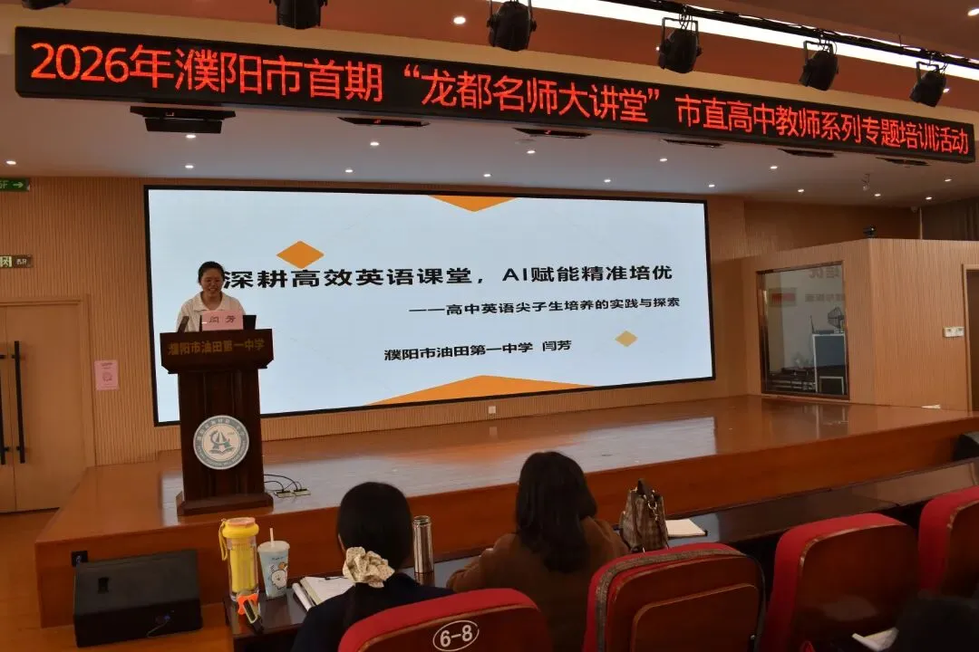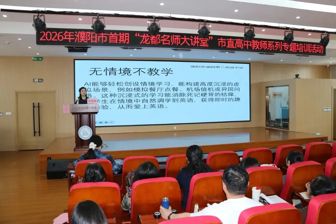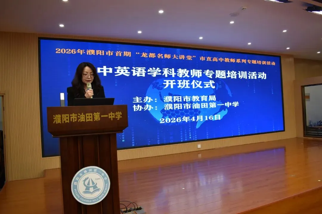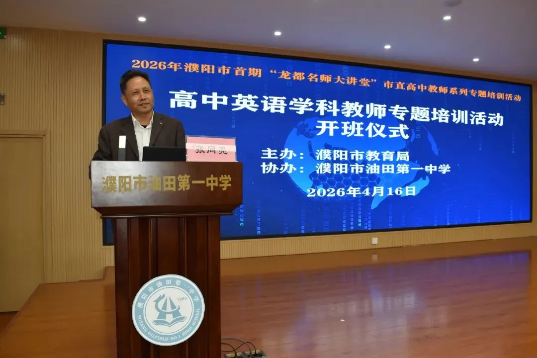为深入推进教育数字化转型,推动人工智能与英语教学深度融合,破解英语教学痛点难点,全面提升全市英语教师专业素养与教学效能,4月16日至17日,由濮阳市教育局主办、濮阳市油田第一中学协办的2026年“龙都名师大讲堂”AI赋能英语教学专题培训,在市油田一中综合楼六楼报告厅顺利举行。