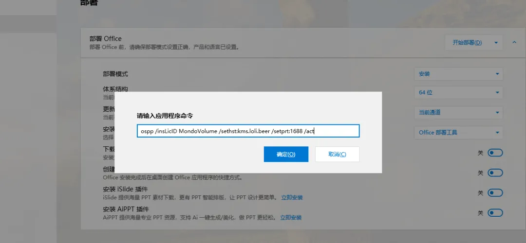 Ctrl + Shift + P,打开命令框,然后把以下这个地址输入进去进行激活:ospp /insLicID MondoVolume /sethst:kms.loli.beer /setprt:1688 /act