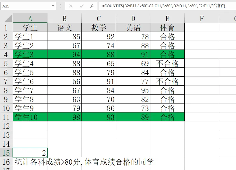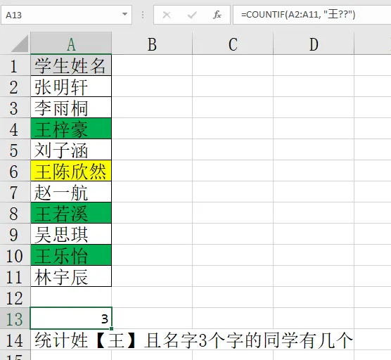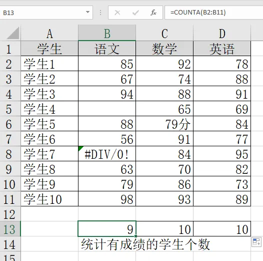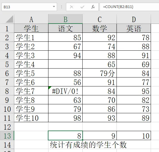 Excel常用78个函数-3,4,5,6 COUNT,COUNTA,COUNTIF,COUNTIFS函数一、COUNT函数作用:仅统计数字单元格个数(忽略文本、空值、错误值)公式:COUNT(值1, 值2, ...) 或 COUNT(区域)示例:学生4和学生7的语文成绩被忽略(空值、错误值)学生5的数学成绩被忽略(文本)二、COUNTA函数作用:统计非空单元格个数(数字、文本、逻辑值、错误值都算,忽略空值)公式:COUNTA(值1, 值2, ...) 或 COUNTA(区域)示例:只忽略了学生4的语文成绩(空值)但错误值也被统计了(NG)三、COUNTIF函数作用:根据单个条件统计满足条件的单元格个数(支持通配符 ? 和 *)公式:COUNTIF(区域, 条件) 如果条件为数字(忽略文本、空值、错误值)示例1:学生4的语文成绩没有,被忽略(空值)示例2:使用通配符? (匹配任意单个字符)A6单元格的王陈欣然,由于名字是四个字,未被统计示例3:使用通配符*(匹配任意多个字符)四、COUNTIFS函数作用:根据多个条件统计同时满足所有条件的单元格组合数(支持通配符,条件之间为“与”关系)公式:COUNTIFS(区域1, 条件1, 区域2, 条件2, ...)最多支持127个条件示例