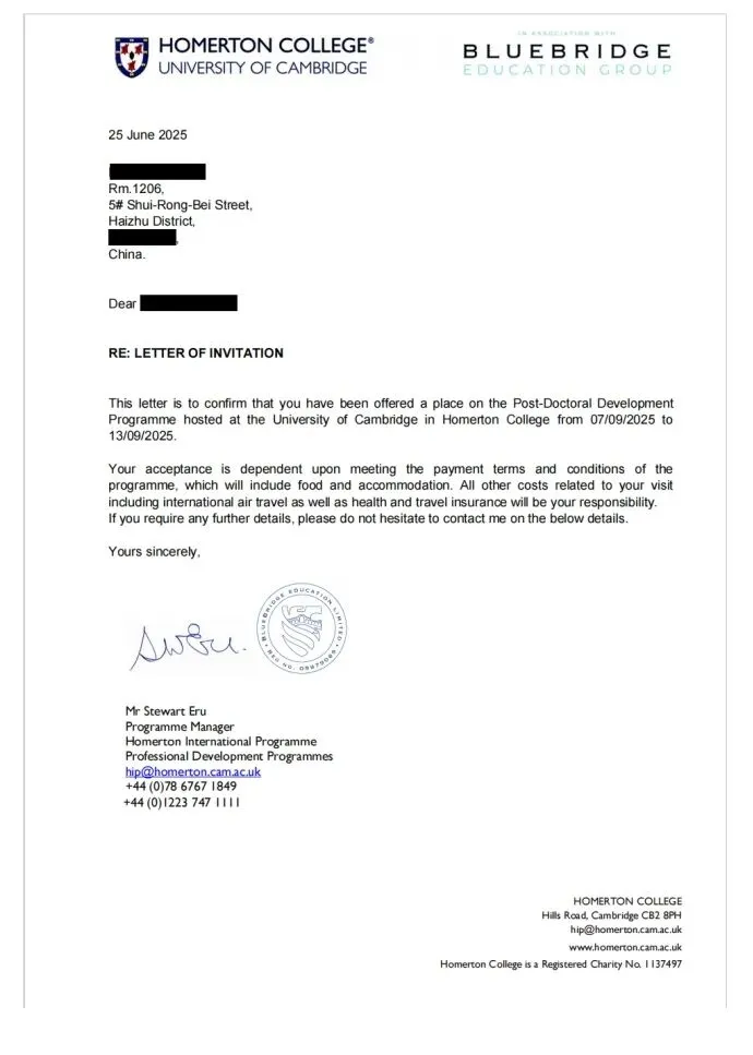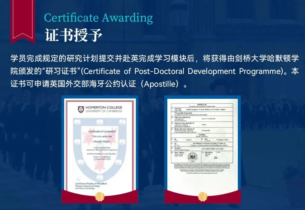 学员完成规定的研究计划提交并赴英完成学习模块后,将获得由剑桥大学哈默顿学院颁发的“研习证书”