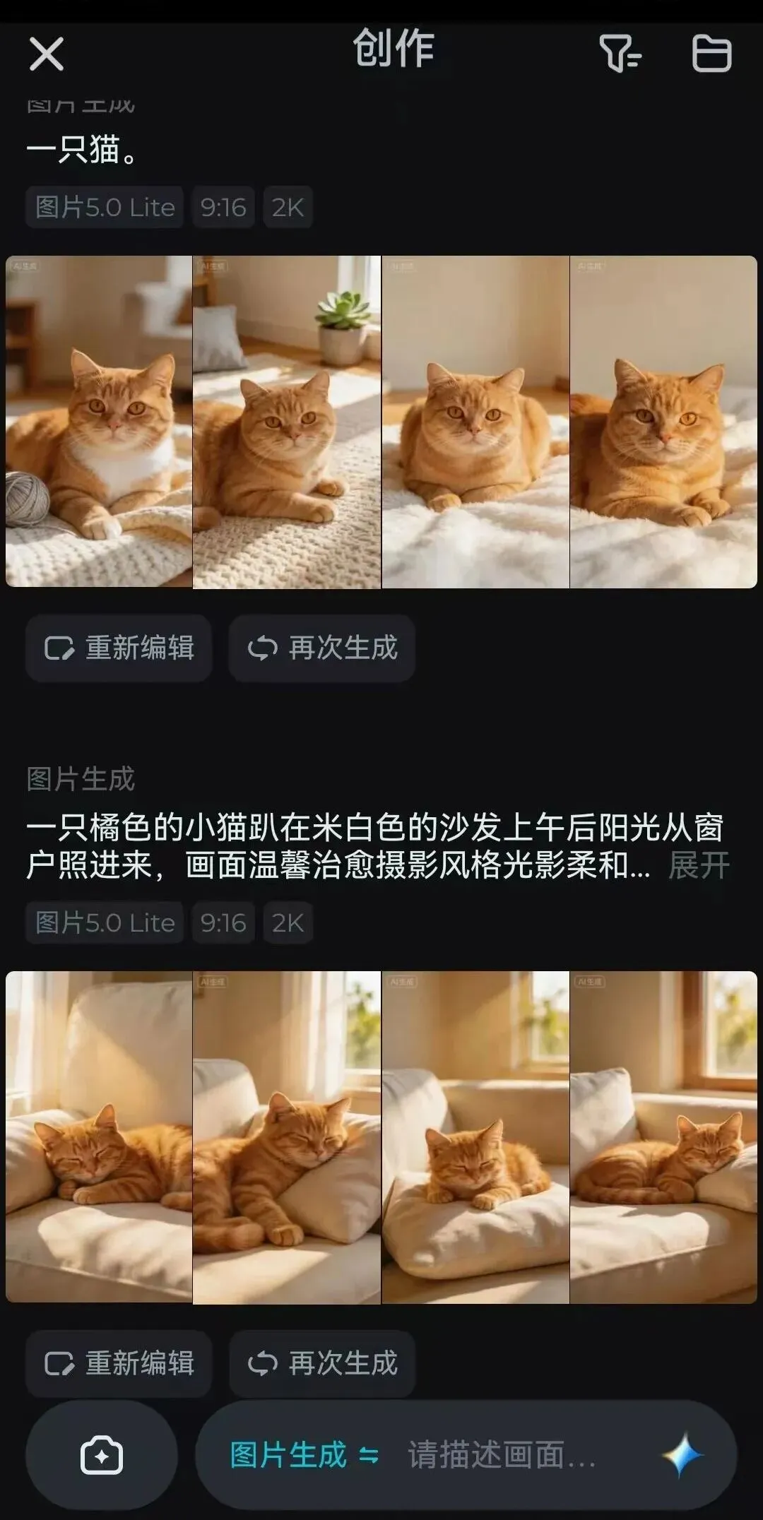 ✅ 强提示词:"一只橘色的小猫,趴在米白色的沙发上,午后阳光从窗户照进来,画面温馨治愈,摄影风格,光影柔和,暖色调,近景视角"