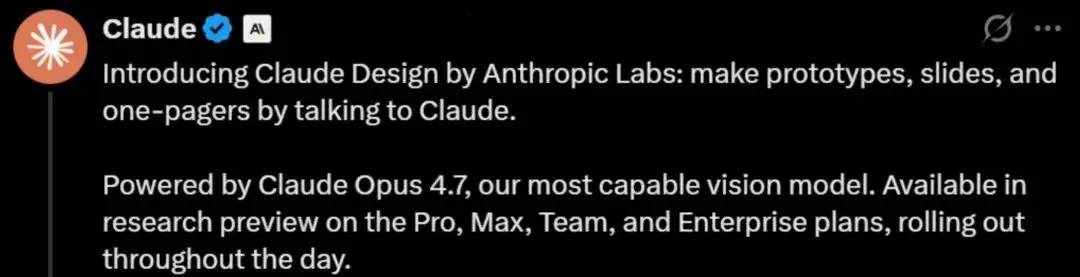 Anthropic正式推出了全新产品 Claude Design,搭载最新的 Claude Opus 4.7 视觉大模型,主打一个:用聊天就能做设计。