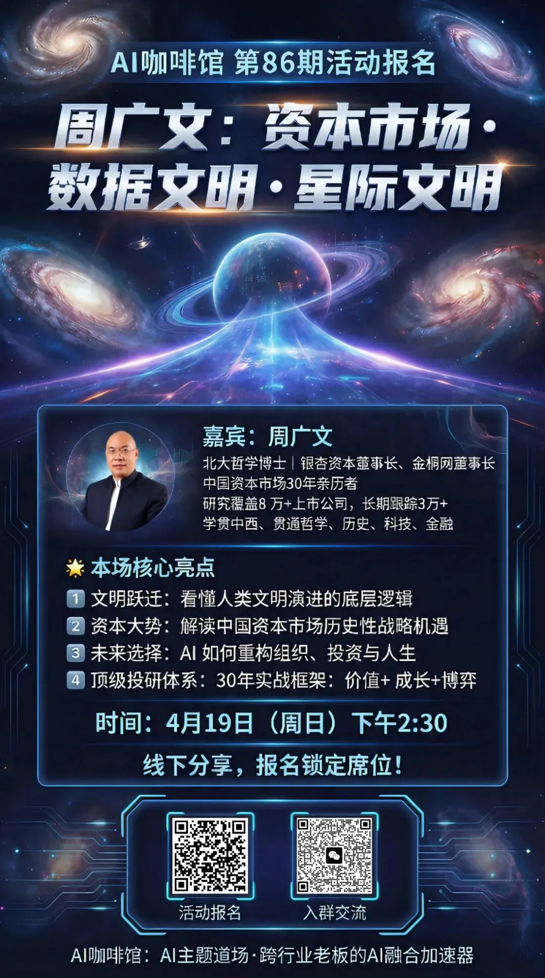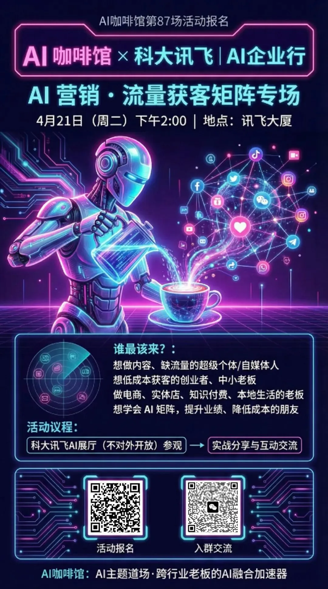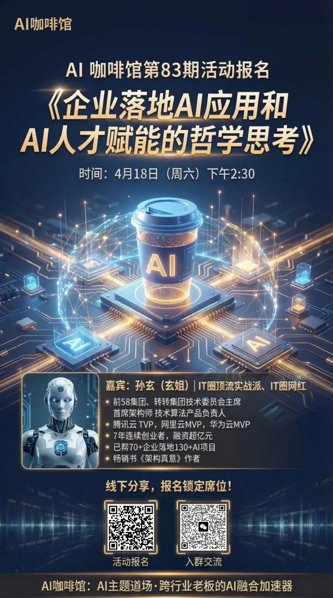 4月,AI咖啡馆三场重磅活动,从企业落地→资本大势→中年突围,帮你在技术狂飙中,找到属于自己的确定性。