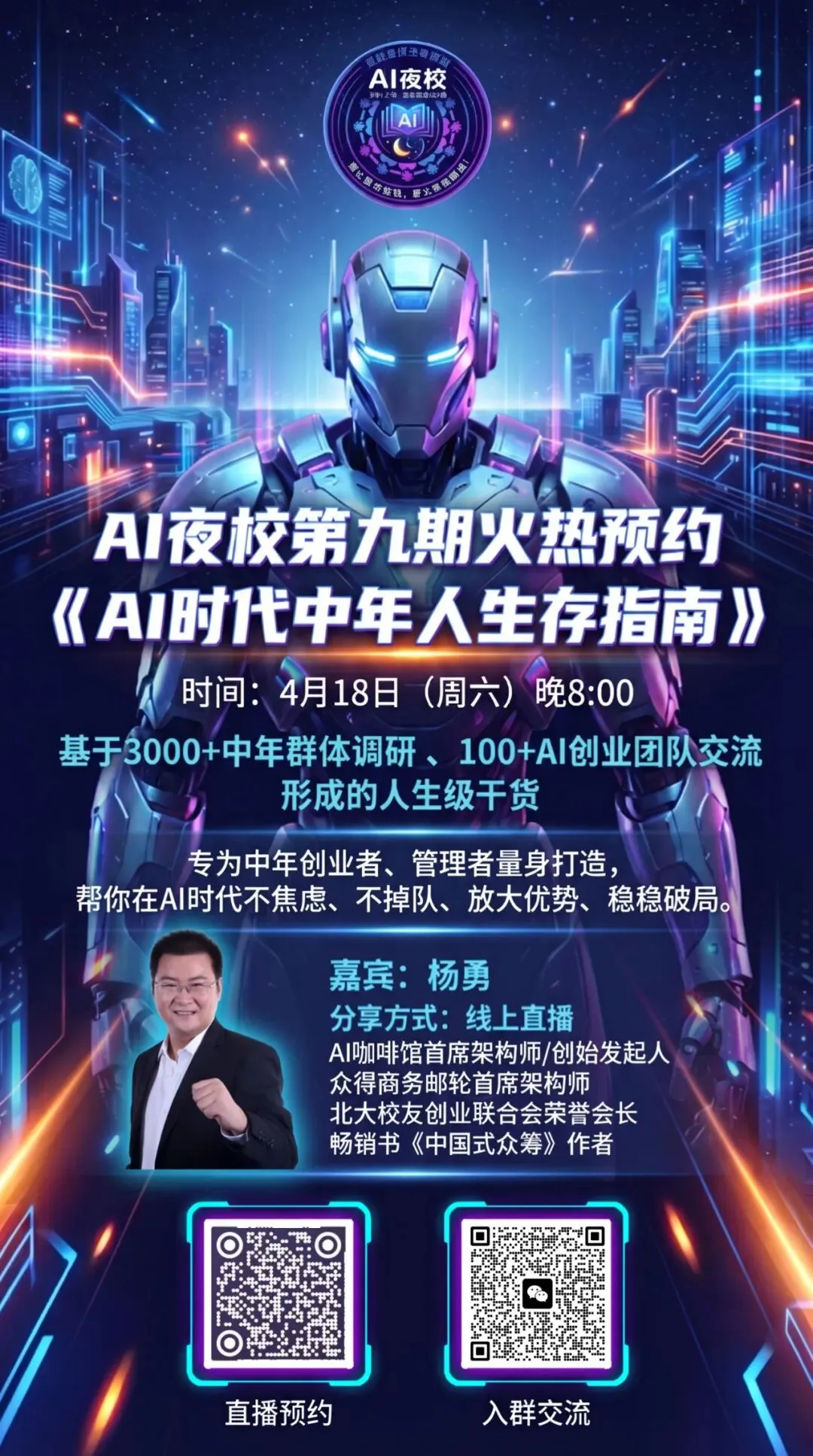 这场线上直播,由AI咖啡馆创始发起人、《中国式众筹》作者杨勇老师,基于3000+中年群体调研、100+AI创业团队交流,给出一套可落地的生存破局方案: